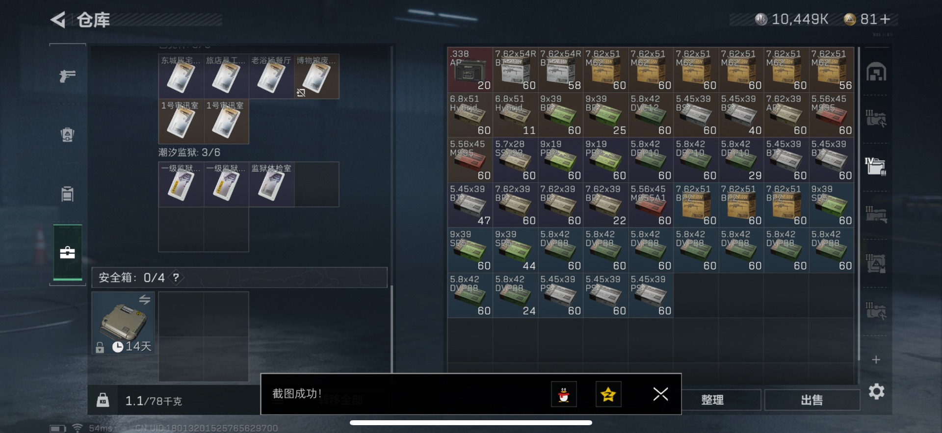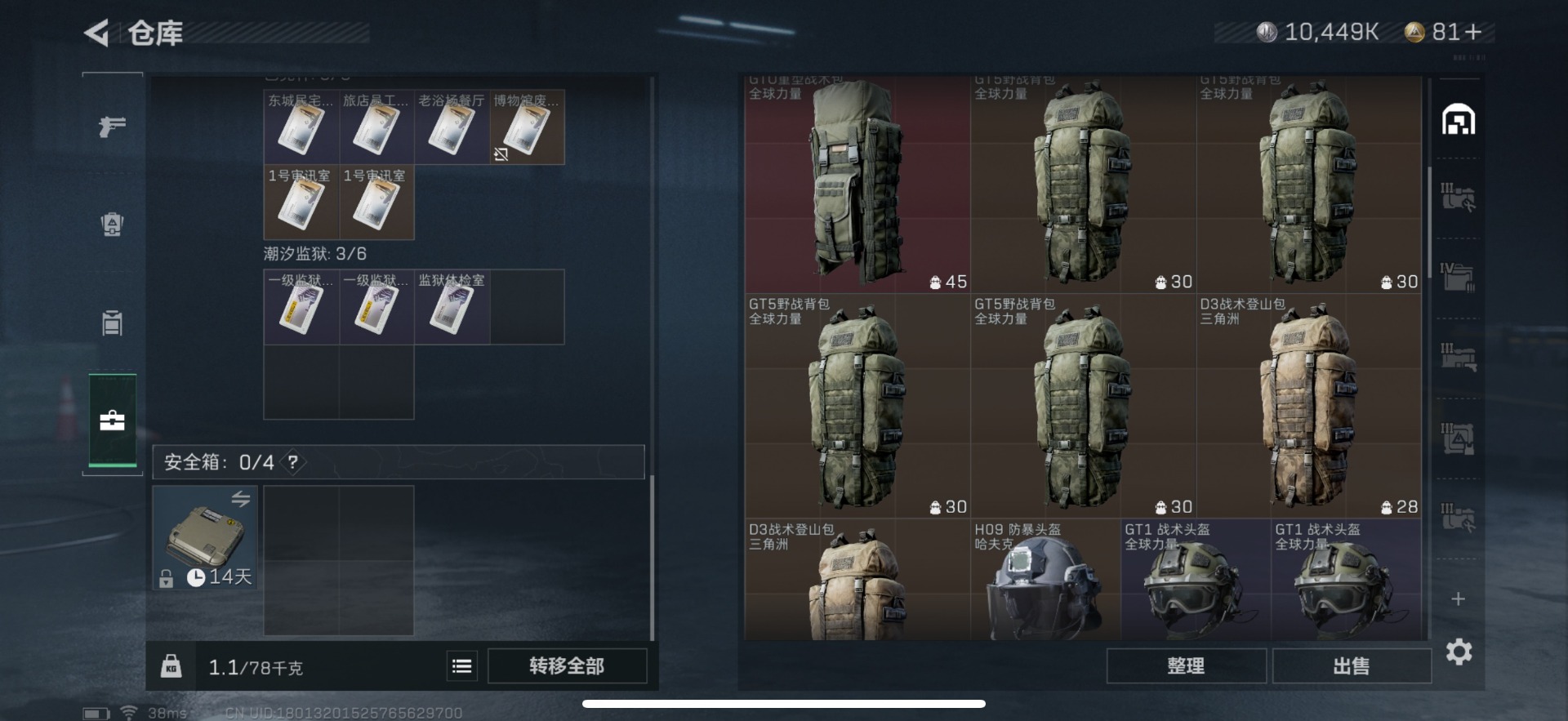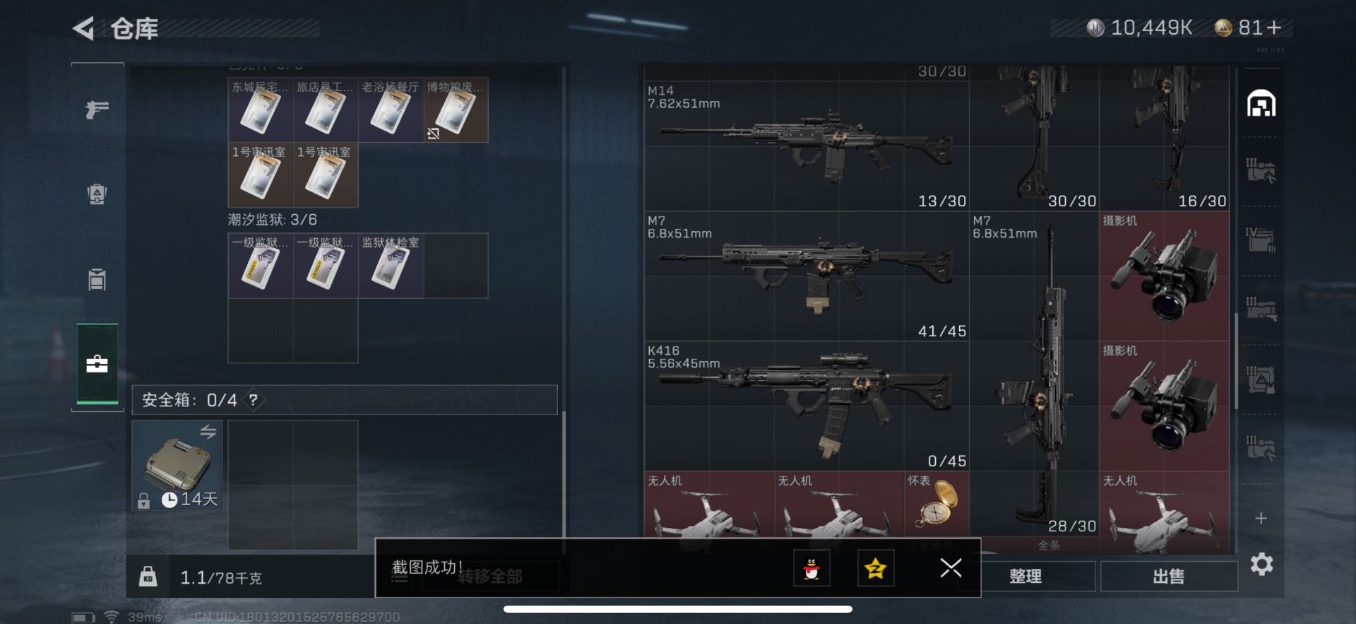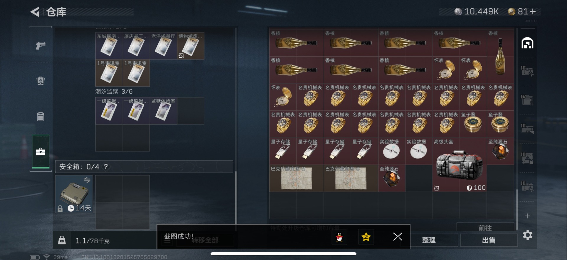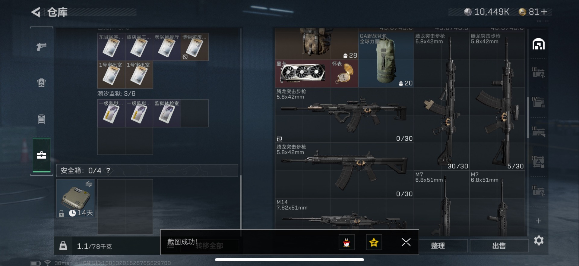 - [11877410]总资产:383 1近战传说 6传说枪械 顶级安全箱(3×3)9.15号到期 可二次 可修改实名 优质装备:近战-黑海,顶级安全箱(3x3) 烽火地带段位:铂金 全面战场段位:无段位 哈夫币:38.118 传说武器皮肤:UZI冲锋枪-特斯拉线圈,SR-3M紧凑突击步枪-特斯拉线圈,AK-12突击步枪-特斯拉线圈,725双管霰弹枪-送葬人-无题密令,勇士冲锋枪-能天使-午夜邮差 史诗武器皮肤:AUG突击步枪-蝮蛇,M700狙击步枪-蝮蛇,勇士冲锋枪-深海恐惧,AKM突击步枪-林中猎手,.357左轮-幸运时刻,M16A4突击步枪-竞赛选手,SVD狙击步枪-荒野求生,M1014霰弹枪-林中猎手,SV-98狙击步枪-林中猎手,PTR-32突击步枪-英雄,PSG-1射手步枪-无垢,AS Val突击步枪-典狱官,Vector冲锋枪-阿萨拉文明,M14射手步枪-黑鹰坠落,M700狙击步枪-竞技风