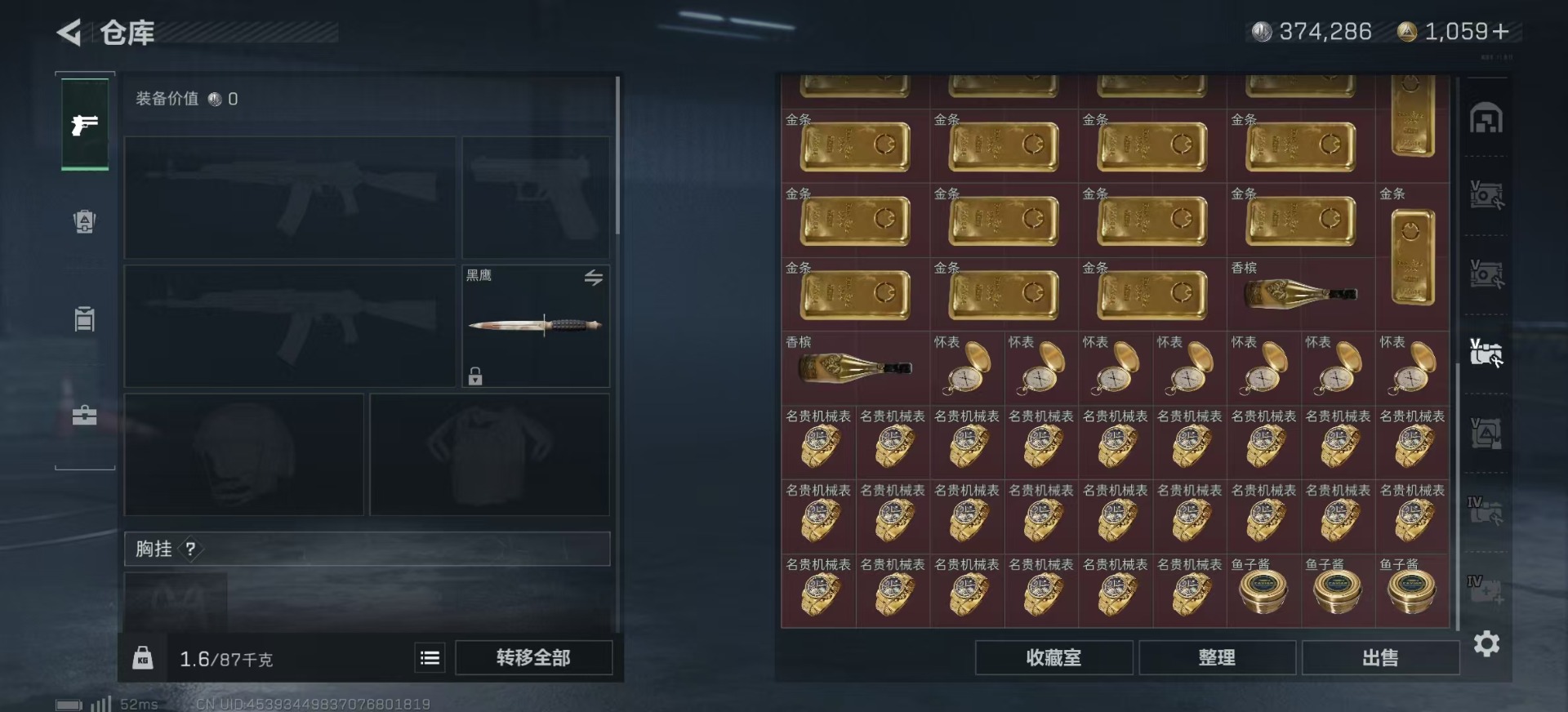 - [11864677]【商品标题】:上海二区-24V-0王者-0炫金 【热门武器】:QBZ03-金色蔷薇,金色蔷薇-古蛇迷踪,修罗-古蛇迷踪,M200-竞技荣光,白虎-电玩蓝兔,炽芒蝶刃 【音效卡】:星神-古蛇迷踪音效卡 【角色】:电竞教官-云悠悠,战地猎狐 【人偶武器】:迷你深渊冰龙,迷你艾比,生化手雷-机甲核心*2 【英雄级武器】:M200-竞技荣光,柯尔特-竞技荣光,擎天-竞技荣光,高爆手雷-竞技荣光*2,烟雾弹-竞技荣光*2,闪光弹-竞技荣光*2,QBZ03-金色蔷薇,金色蔷薇-古蛇迷踪,白虎-电玩蓝兔,M4A1-雷神,Barrett-极光,黑武士-锦绣游龙,M4A1-赤狱骑士,修罗-古蛇迷踪,炽芒蝶刃 【特殊枪械】:0白虎,0黑骑士,0烈龙,0盘龙,0炼狱,0蝴蝶斯泰尔