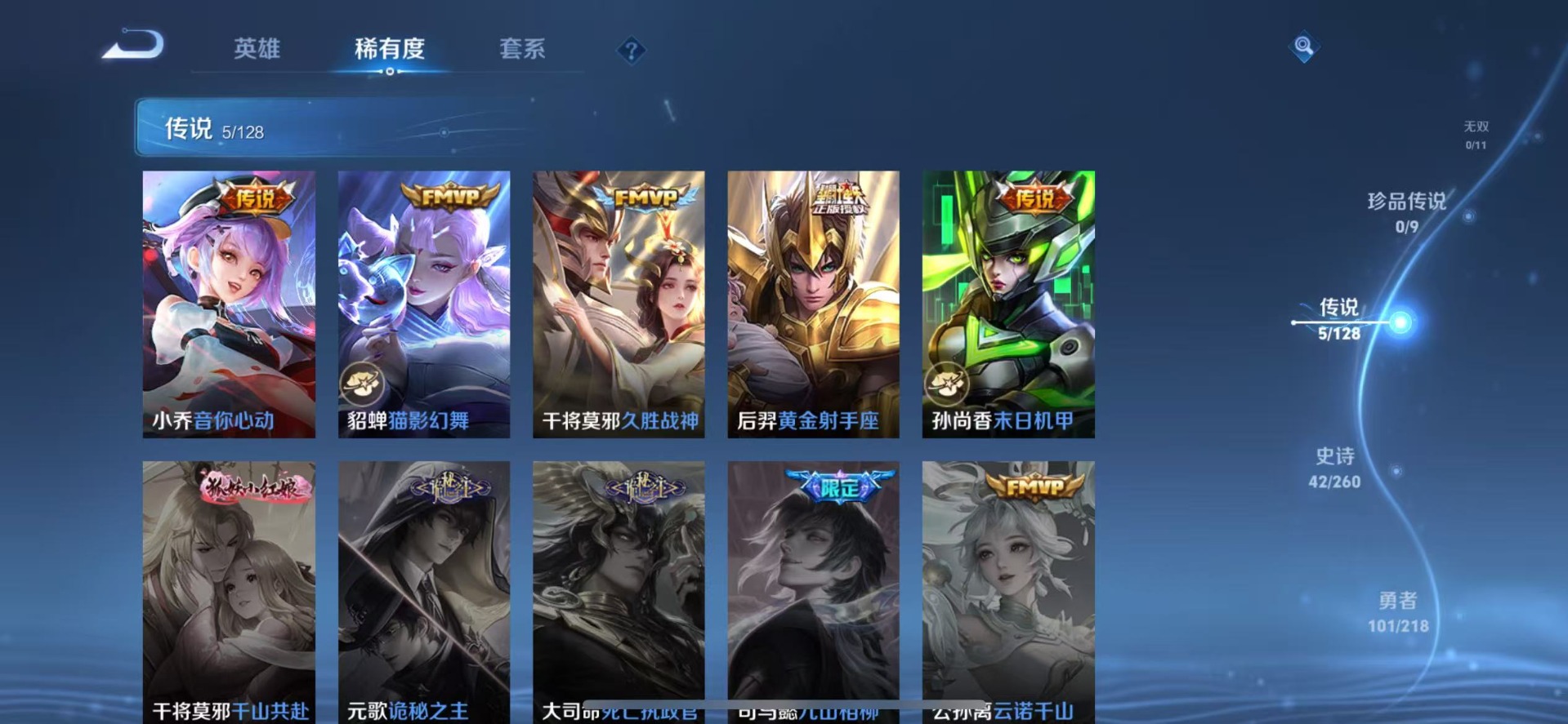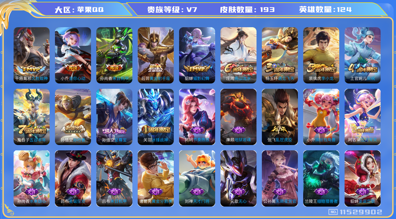 - [12023098]V8 7传说 125英雄 261皮肤 可修改实名 女号 优质装备:黄金射手座,末日机甲-孙尚香(绿蚂蚱),地狱火 传说皮:云诺千山 珍宝阁皮:优雅恋人,蔷薇恋人 限定皮:愿照·九州拓(澜年限),鸣野蒿,至尊宝,高山流水,五谷丰年,梁祝,御风骁将(吕布年限),逐梦之音,引擎之心,玉兔公主 史诗皮:鸭鸭历险记-刘禅,器灵·浮梦炉,化蝶舞,星界战将,龙之律动,茶境仙,破空之剑,蔬乡物语(鲁班七号),百相守梦-黄忠,黄金分割率,特工魅影,千年之狐,永昼,江河有灵,雪夜绮愿(周瑜),百解令(蒙犽),蒙恬荣光圣徽,冰冠公主,青蛇,白蛇,电玩·爆裂旋风,暗夜猫娘,末日机甲-吕布,猫狗日记-大乔,时之恋人-孙尚香,节奏热浪,女仆咖啡,摇滚巨星,水果甜心,绅士熊喵,天才门将,星夜王子,心灵骇客,德古拉伯爵,暗隐猎兽者,鬼剑武藏,舞动绿茵,纤云弄巧,繁星吟游(呼啦呼啦),拒霜思,缤纷独角兽,乘风破浪,逐浪之夏,曙光守护者,箭羽风息,金属风暴,圣诞狂欢,圣诞恋歌,鹰眼统帅,暗夜贵公子,魅力维加斯,无心