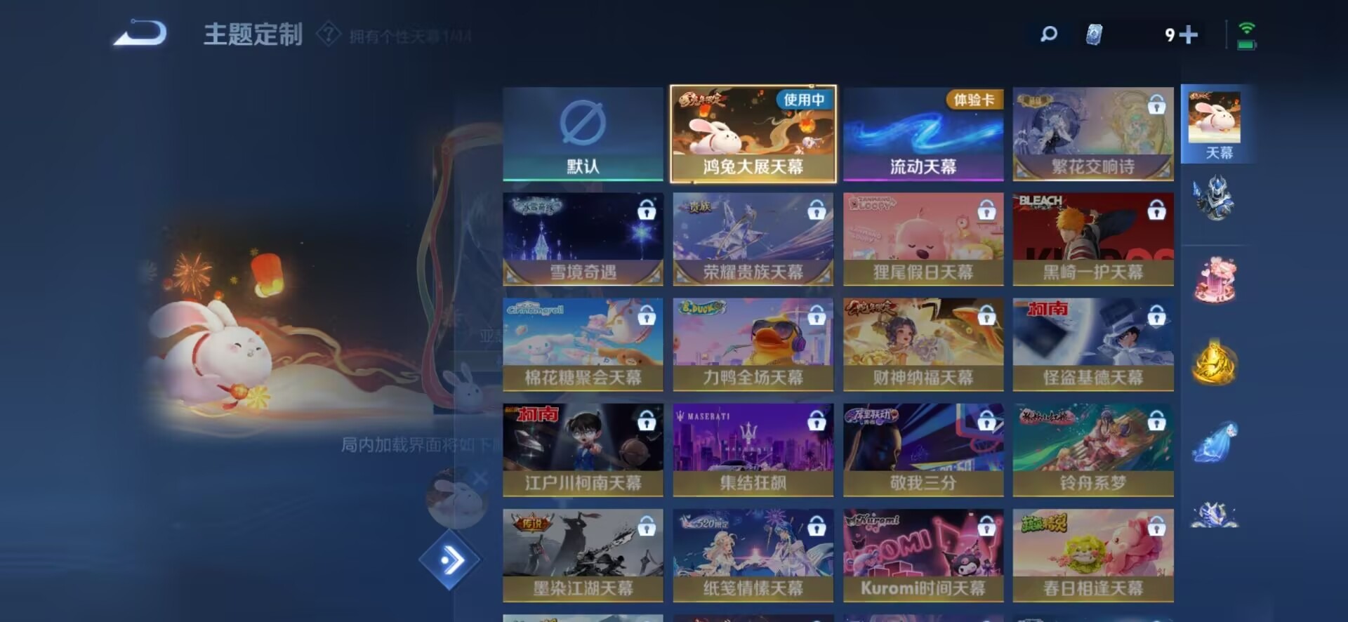 大乔猫狗日记,大乔乘龙·忆丹青,刘邦德古拉伯爵,夏侯惇乘风破浪,阿轲暗夜猫娘,沈梦溪匿光破解者,曹操幽灵船长,伽罗箭羽风息,小乔缤纷独角兽,孙尚香时之恋人,阿古朵顽趣,不知火舞魅语,赵怀真器灵·浮梦炉,鲁班七号电玩小子,吕布圣诞狂欢,露娜紫霞仙子,诸葛亮黄金分割率,刘禅电玩·爆裂旋风,宫本武藏鬼剑武藏,杨玉环银翎春语,公孙离无限星赏官,兰陵王暗隐猎兽者,貂蝉圣诞恋歌,花木兰水晶猎龙者,夏洛特永昼,李白千年之狐,安琪拉心灵骇客,安琪拉乘龙·聚宝船,蒙犽百解令,艾琳奇遇舞章,白起星夜王子,西施诗语江南,亚瑟心灵战警,程咬金功夫厨神,百里玄策热力回旋,百里玄策原初追逐者,雅典娜冰冠公主,雅典娜黎明之约,韩信白龙吟,李元芳逐浪之夏,墨子龙骑士,墨子金属风暴,蔡文姬舞动绿茵,澜赏金猎手,弈星滕王阁序,娜可露露晚萤,王昭君偶像歌手,嫦娥拒霜思,橘右京修罗