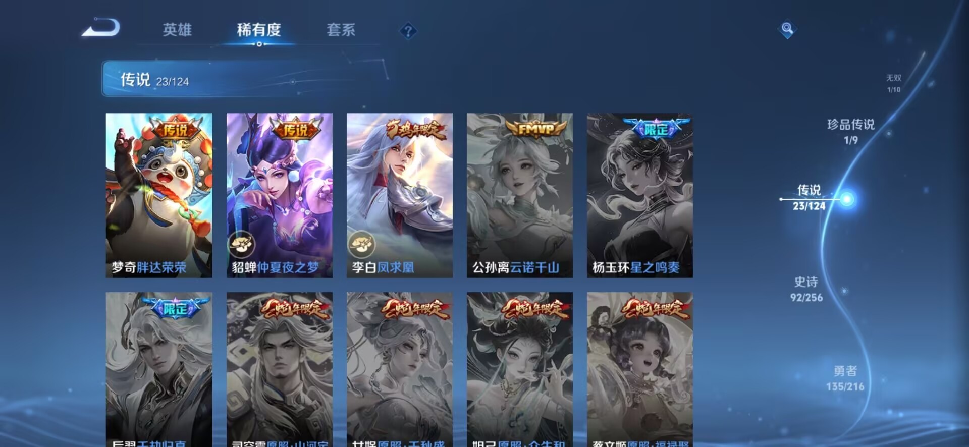 黄忠烈魂,张飞虎魄,不知火舞绯月行,诸葛亮时雨天司,公孙离祈雪灵祝,杨玉环寅虎·心曲,裴擒虎李小龙,上官婉儿梁祝,花木兰青春决赛季,马可波罗山海·玄木吟,孙悟空孙行者,雅典娜神奇女侠,韩信飞衡,百里守约朱雀志,瑶山海·碧波行,澜愿照·九州拓,王昭君凤凰于飞