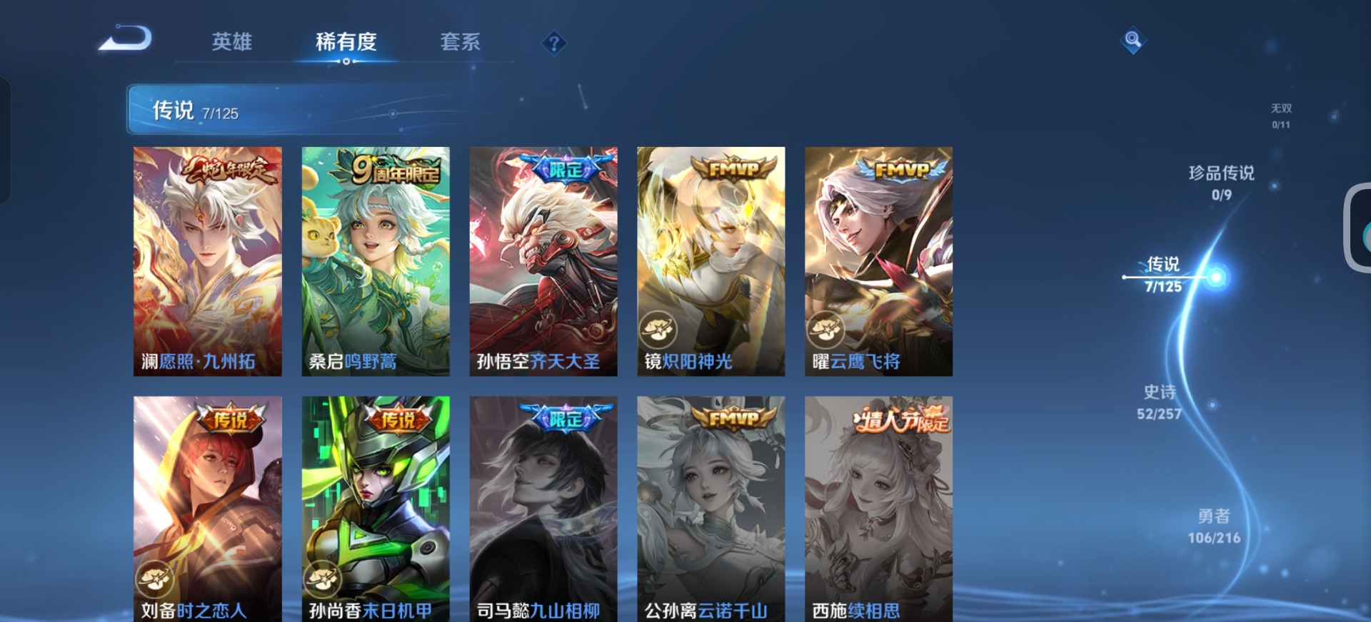 - [11853067]V7 1典藏 1无双 11传说 123英雄 303皮肤 可修改实名 优质装备:弑枪猎影(韩信典藏),碎月剑心(李白无双),黄金狮子座,冠军飞将,末日机甲-孙尚香(绿蚂蚱),时之恋人-刘备(电焊工),末日机甲-孙策,山海·炽霜斩(李信年限),琥珀纪元马超 传说皮:幻光神枪 珍宝阁皮:妄想食味,蔷薇恋人,女武神 限定皮:愿照·九州拓(澜年限),鸣野蒿,至尊宝,太华(伽罗年限),傲雪梅枪,飞衡(韩信年限),遇见飞天,高山流水,五谷丰年,游园惊梦,梁祝,李小龙,逐梦之影,引擎之心,匿光追影者,山海·玄木吟(马可年限) 史诗皮:鸭鸭历险记-刘禅,星界战将,龙之律动,茶境仙,破空之剑,紫霞仙子,黄金分割率,特工魅影,千年之狐,江河有灵,魅语,百解令(蒙犽),高渐离燃音魔法,蒙恬荣光圣徽,冰冠公主,偶像歌手,暗夜猫娘,末日机甲-吕布,猫狗日记-大乔,乱世虎臣,节奏热浪,修罗,女仆咖啡,摇滚巨星,水果甜心,天才门将,星夜王子,心灵骇客,功夫厨神,德古拉伯爵,暗隐猎兽者,幽灵船长,鬼剑武藏,乐园奇幻夜,舞动绿茵,地狱岩魂,纤云弄巧,拒霜思,缤纷独角兽,乘风破浪,逐浪之夏,月团寄思,水晶猎龙者,金属风暴,原初追逐者,圣诞狂欢,圣诞恋歌,鹰眼统帅,暗夜贵公子,黎明之约,无心,未来纪元-赵云