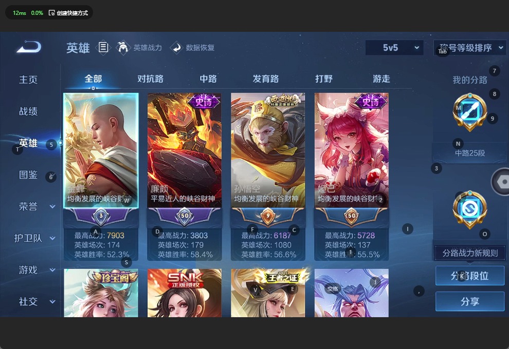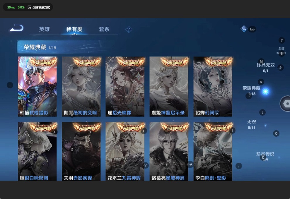 - [11578934]猴子典藏,久胜,紫霞,-可二次-108英雄-165皮肤-1典藏-7传说-31史诗 辉光之辰-后羿 街头霸王-韩信