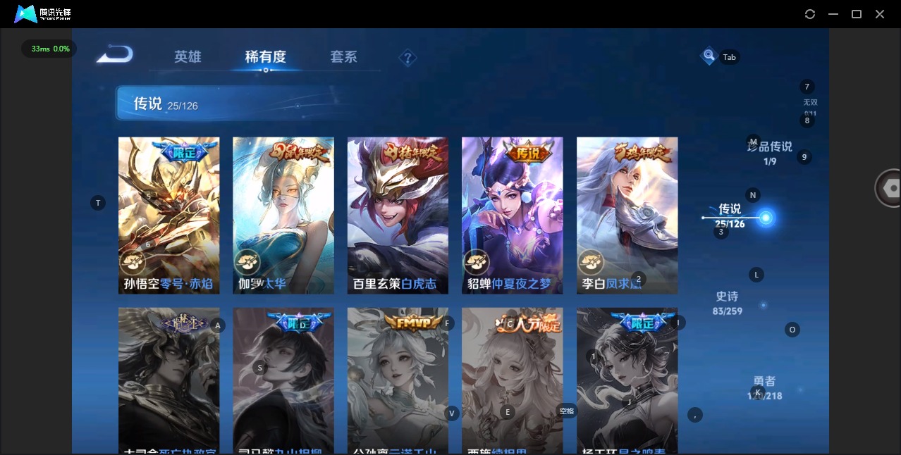 - [11553325]V4 6传说 119英雄 122皮肤 可修改实名 优质装备:久胜战神,无双飞将,碎云,追逃游戏(亚瑟),涂山容容 珍宝阁皮:妄想食味,蔷薇恋人 限定皮:鸣野蒿,齐天大圣,五谷丰年,梁祝,圣诞老人 史诗皮:星界战将,蒙犽顽岩魄,琥珀纪元伽罗,黄金分割率,特工魅影,江河有灵,百解令(蒙犽),蒙恬荣光圣徽,猫狗日记-孙策,女仆咖啡,水果甜心,心灵骇客,德古拉伯爵,鬼剑武藏,心灵战警,地狱岩魂,拒霜思,乘风破浪,曙光守护者,金属风暴,鹰眼统帅,魅力维加斯,黎明之约