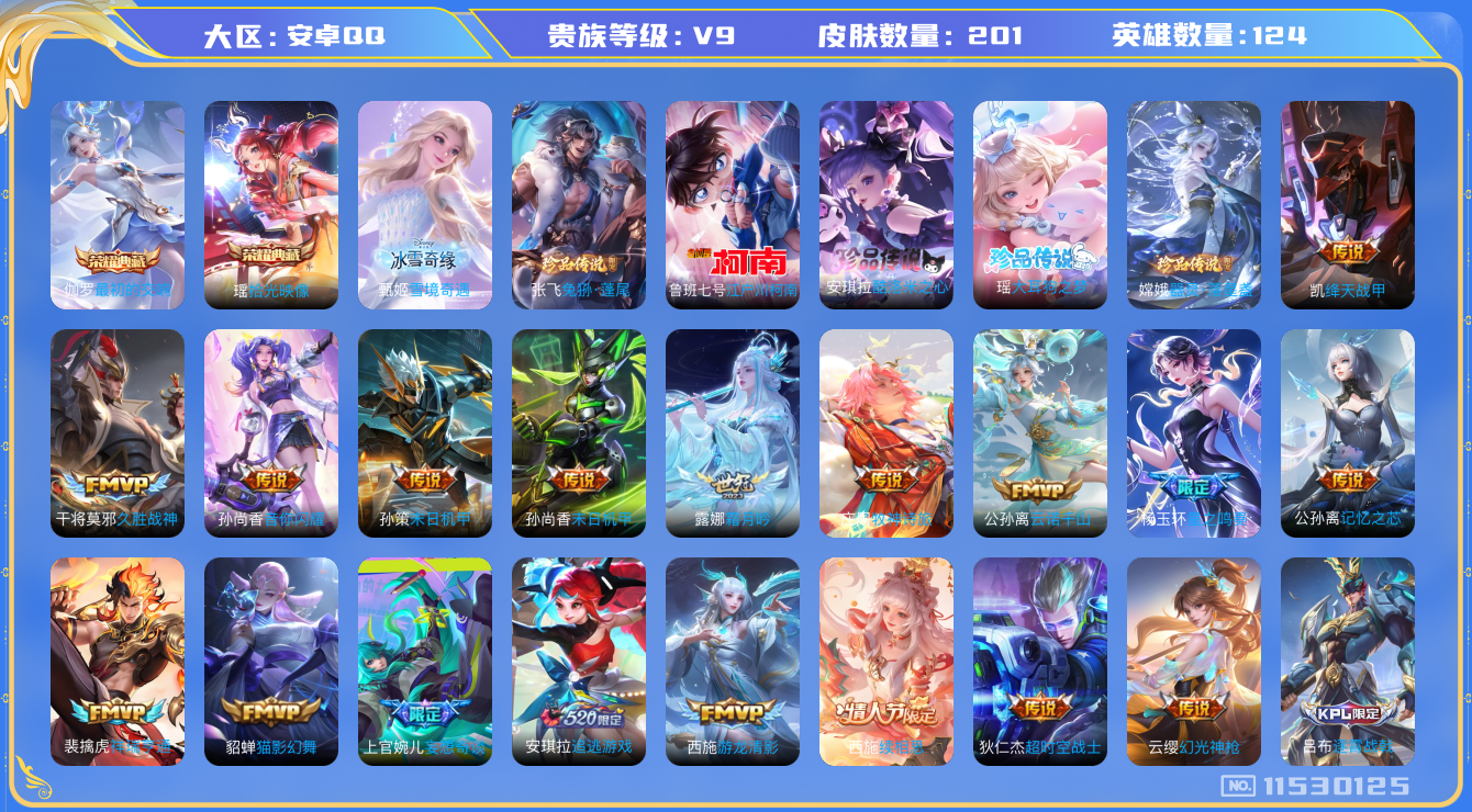 [11530125]V9 2典藏 1无双 5珍品传说 27传说 124英雄 201皮肤 可修改实名 女号 优质装备:拾光映像(瑶典藏),雪境奇遇-甄姬,最初的交响(伽罗典藏),江户川柯南,器灵·落星盏,酷洛米之心,大耳狗之梦,绛天战甲(鸡嘴战神),猫影幻舞,久胜战神,末日机甲-孙尚香(绿蚂蚱),游龙清影(小青龙),超时空战士-狄仁杰,末日机甲-孙策,音你闪耀(rap皮),记忆之芯(机甲兔),追逃游戏(安琪拉),妄想奇谈,霜月吟,牧神诗旅 珍品传说:兔狲·蓬尾 传说皮:云诺千山,续相思,星之鸣奏,祥瑞亨通,幻光神枪 珍宝阁皮:妄想食味 限定皮:愿照·九州拓(澜年限),愿照·福禄聚(蔡文姬年限),愿照·岁时盈(虞姬年限),愿照·山河定(司空震年限),愿照·众生和(妲己年限),愿照·千秋盛(女娲年限),逐霄战戟,映山客,陌上桑,鸣野蒿 史诗皮:鸭鸭历险记-刘禅,器灵·浮梦炉,狼魂孤将,绮世丹青,瑰影绮梦,化蝶舞,龙之律动,雪豹·霜爪,藏狐·褐绒,布丁狗之誓,茶境仙,涂山红红,蔬乡物语(鲁班七号),乘龙·聚宝船(安琪拉年限),百相守梦-百里守约,星界特工,遇见神鹿,紫霞仙子,苍穹之光,特工魅影,魅语,高渐离燃音魔法,青蛇,偶像歌手,白蛇,龙骑士(小龙虾),末日机甲-吕布,节奏热浪,女仆咖啡,摇滚巨星,水果甜心,绅士熊喵,星夜王子,心灵骇客,时之奇旅-安琪拉,鬼剑武藏,心灵战警,乐园奇幻夜,舞动绿茵,地狱岩魂,诗语江南,纤云弄巧,拒霜思,缤纷独角兽,水晶猎龙者,唤灵魅影,鹰眼统帅,魅力维加斯,奇遇舞章