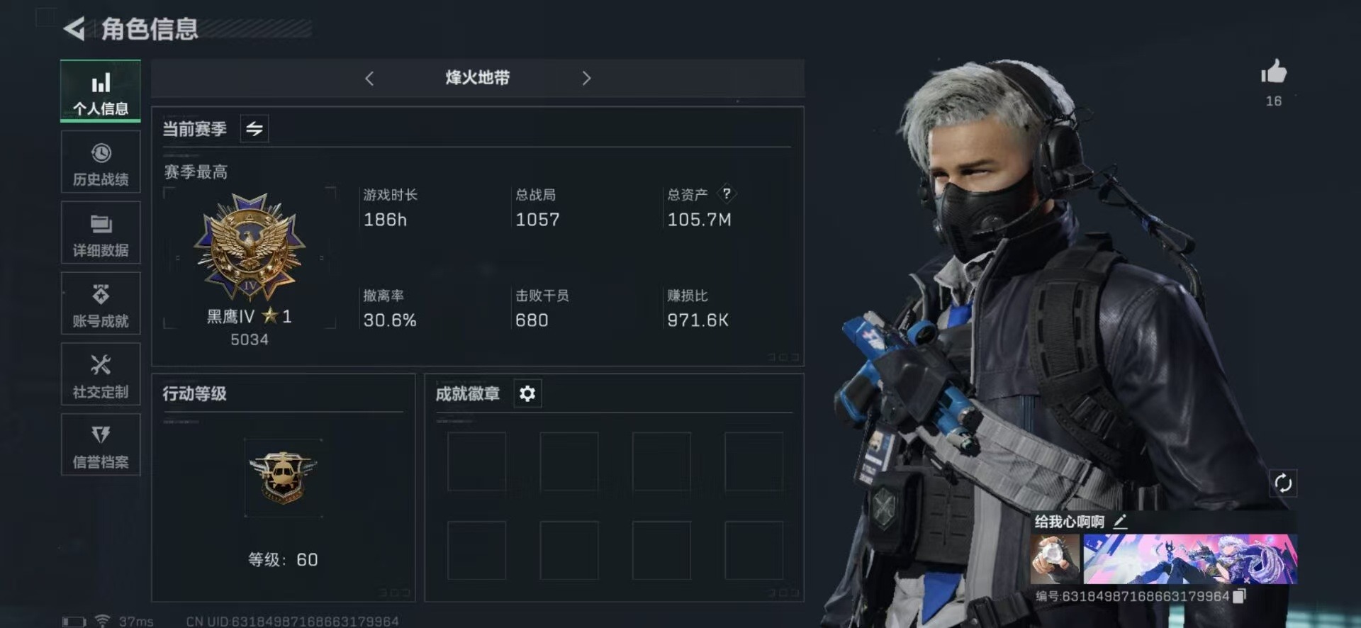 [11530133]总资产:105.7 8传说枪械 高级安全箱(9.17到期) 可二次 可修改实名 烽火地带段位:黑鹰 全面战场段位:无段位 哈夫币:1.865 传说武器皮肤:AK-12突击步枪-夜鹰,CAR-15突击步枪-阿米娅,复合弓-黑-天际线,AK-12突击步枪-特斯拉线圈,SR-3M紧凑突击步枪-特斯拉线圈,UZI冲锋枪-特斯拉线圈,勇士冲锋枪-能天使-午夜邮差,725双管霰弹枪-送葬人-无题密令 史诗武器皮肤:PKM通用机枪-蝮蛇,PKM通用机枪-荒野求生,AS Val突击步枪-尖端治疗,M700狙击步枪-守夜人,SG552突击步枪-尖端治疗,Ash-12战斗步枪-守夜人,SR-3M紧凑突击步枪-荒野求生,勇士冲锋枪-深海恐惧,AKM突击步枪-林中猎手,SVD狙击步枪-暗夜猎手,M16A4突击步枪-竞赛选手,PKM通用机枪-守夜人,SVD狙击步枪-荒野求生,M1014霰弹枪-林中猎手,SV-98狙击步枪-林中猎手,PTR-32突击步枪-英雄,PSG-1射手步枪-无垢,AS Val突击步枪-典狱官,SV-98狙击步枪-囚徒,腾龙突击步枪-无垢,MP7冲锋枪-无垢,Vector冲锋枪-阿萨拉文明