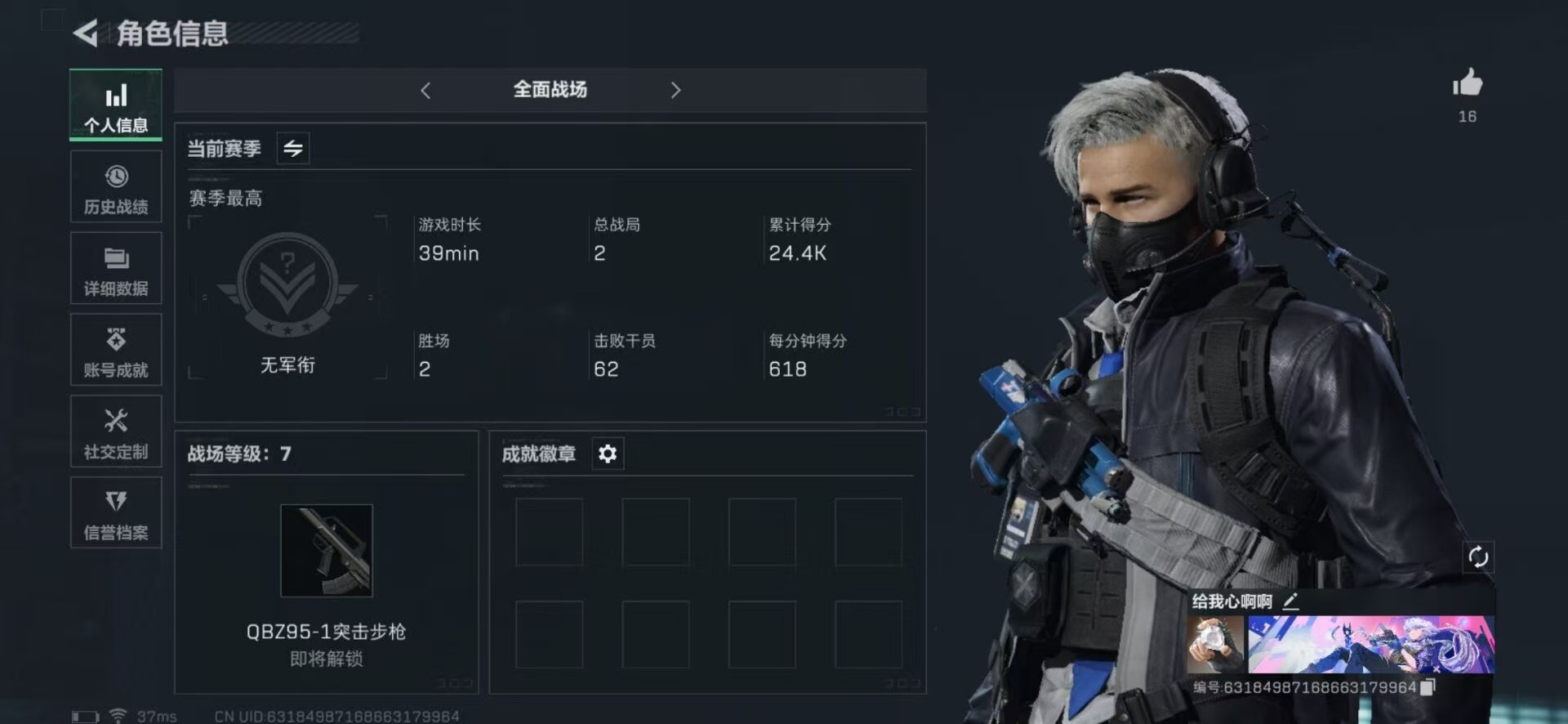 - [11679472]总资产:312M 1近战传说 7传说枪械 哈夫币:120K 高级安全箱(2×3)9.15号到期 可二次 可修改实名 优质装备:近战-北极星 烽火地带段位:钻石 全面战场段位:尉官 传说武器皮肤:M16A4突击步枪-狩猎时刻,M4A1突击步枪-阿米娅,CAR-15突击步枪-阿米娅,Vector冲锋枪-狩猎时刻,G3战斗步枪-狩猎时刻,CAR-15突击步枪-黑鹰坠落 史诗武器皮肤:K416突击步枪-潜袭者,AUG突击步枪-蝮蛇,Ash-12战斗步枪-守夜人,M16A4突击步枪-竞赛选手,SG552突击步枪-尖端治疗,SG552突击步枪-深海恐惧,AKM突击步枪-林中猎手,PTR-32突击步枪-英雄,SCAR-H战斗步枪-囚徒