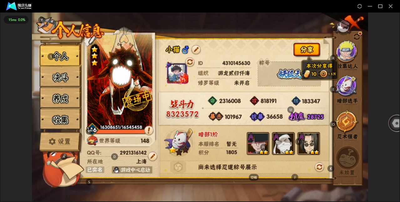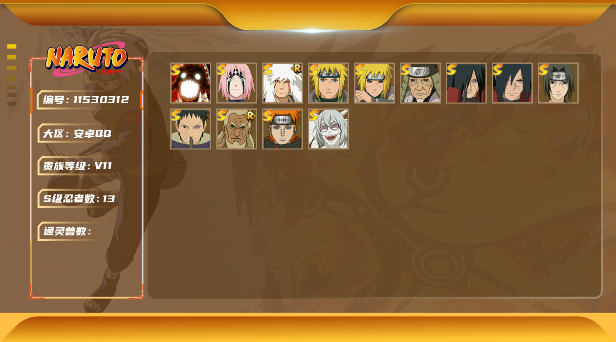 [11530312]V11 13S忍 15A忍 832.3W战力 可二次 可修改实名 优质装备:药师兜「仙人模式」,宇智波斑「秽土转生」,艾「三代目雷影」,波风水门「秽土转生」,猿飞日斩「秽土转生」,宇智波带土 「忍界大战」,春野樱 「忍界大战」,宇智波斑「秽土转生·解」,漩涡鸣人 「暴怒·第六尾」 S级忍者:自来也 「舞之豪杰」,宇智波鼬 「须佐能乎」,佩恩「天道」,波风水门