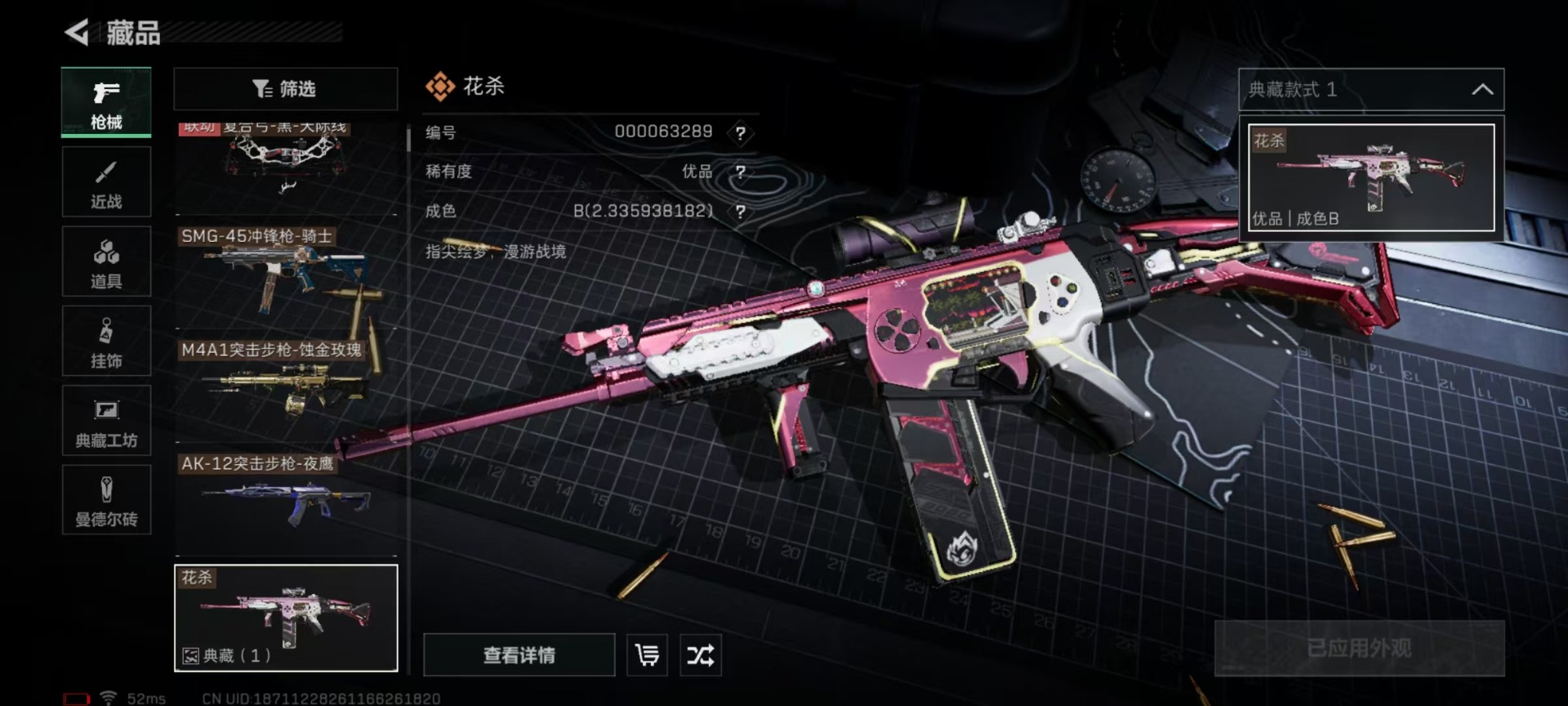- [12197860]18橙皮 13紫皮 77皮肤 27英雄 106卡面 945已用源晶 未定级 优质装备:幻影-千灵华绽,狂徒-紫阙金琅,正义-机动狂飙,冥驹-堕天遗武,戍卫-天界神兵,荒土机兵热能刀,鬼丸国纲,神圣领域 战刀,未来开拓者,离子武器2.0 爪刀,诡秘蛇影,雄鹿-紫阙金琅2.0,鬼魅-耀鳞威龙 亮点皮肤:幻影-2022全球冠军赛,2022全球冠军赛 蝴蝶刀 套装:般若假面//2.0套装,离子武器2.0,2022全球冠军赛,西部未来 佩枪皮肤:狂怒-般若假面//2.0,标配-VCT25xEDG,狂怒-离子武器2.0,正义-西部未来 冲锋枪皮肤:骇灵-离子武器2.0 步枪皮肤:幻影-西部未来,狂徒-双城之战,狂徒-般若假面//2.0,狂徒-噬影者,狂徒-虚空遗器,獠犬-般若假面//2.0,狂徒-离子武器2.0 狙击枪皮肤:飞将-西部未来 机枪皮肤:战神-离子武器2.0,奥丁-西部未来,战神-般若假面//2.0