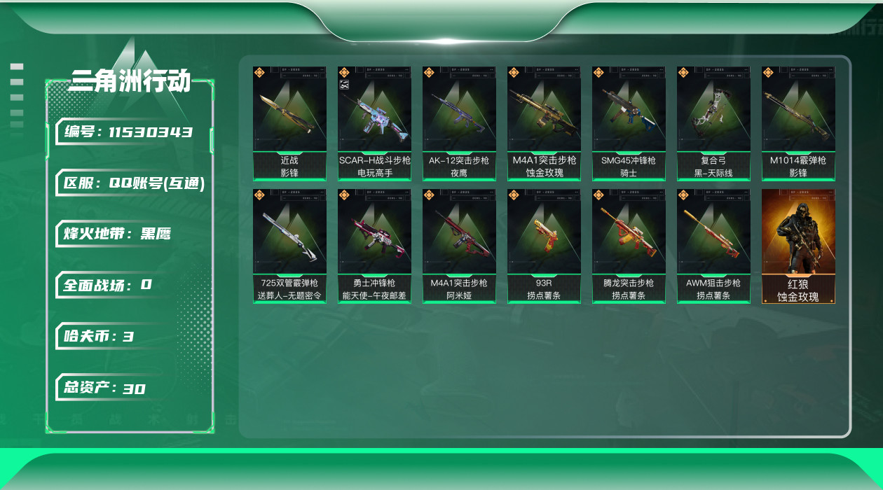 [11530343]总资产:30.7M 1干员外观 1近战传说 13传说枪械 哈夫币:3.840K 高级安全箱(9.17到期) 可二次 可修改实名 优质装备:近战-影锋,SCAR-H战斗步枪-电玩高手 烽火地带段位:黑鹰 全面战场段位:上等兵 传说武器皮肤:M1014霰弹枪-影锋,AK-12突击步枪-夜鹰,SMG45冲锋枪-骑士,M4A1突击步枪-阿米娅,复合弓-黑-天际线,AWM狙击步枪-捞点薯条,腾龙突击步枪-捞点薯条,93R-捞点薯条,勇士冲锋枪-能天使-午夜邮差,725双管霰弹枪-送葬人-无题密令,M4A1突击步枪-蚀金玫瑰 干员外观:红狼-蚀金玫瑰