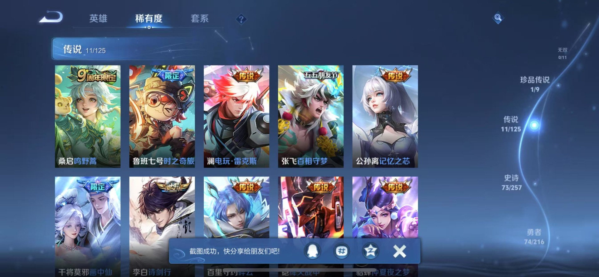 - [11608864]V7 4传说 121英雄 235皮肤 可修改实名 优质装备:黄金狮子座,黄金射手座,超时空战士-狄仁杰 珍宝阁皮:蔷薇恋人 限定皮:白虎志(电光耗子),梅西,遇见飞天,高山流水,青龙志(铠年限),梁祝,李小龙,逐梦之光,玄武志(苏烈年限),朱雀志(守约年限),辉光之辰,霸王别姬-虞姬,大圣娶亲,青春决赛季,冰霜恋舞曲,云端筑梦师 史诗皮:紫霞仙子,苍穹之光,电玩小子(小书包),白龙吟,黄金分割率,特工魅影,千年之狐,无限星赏官,偶像歌手,乱世虎臣,节奏热浪,修罗,女仆咖啡,水果甜心,天才门将,星夜王子,心灵骇客,功夫厨神,德古拉伯爵,暗隐猎兽者,幽灵船长,鬼剑武藏,纤云弄巧,繁星吟游(呼啦呼啦),缤纷独角兽,乘风破浪,逐浪之夏,箭羽风息,金属风暴,原初追逐者,圣诞狂欢,圣诞恋歌,鹰眼统帅,暗夜贵公子,魅力维加斯,黎明之约