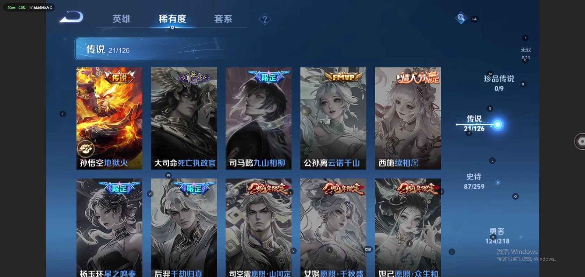 - PX_2103052-Q/永恒钻石/284皮肤/124英雄/3典藏/0珍品无双/0无双/1珍品传说/22传说/78史诗/9稀有英雄 【1 珍品传说】怪盗基德 马可波罗, 【3 典藏皮肤】鸣剑·曳影 李白,银白咏叹调 铠,神鉴启示录 虞姬, 【22 传说皮肤】武圣 关羽,启明星使 虞姬,白虎志 百里玄策,李逍遥 曜,零号·赤焰 孙悟空,地狱火 孙悟空,云鹰飞将 曜,齐天大圣 孙悟空,游龙清影 西施