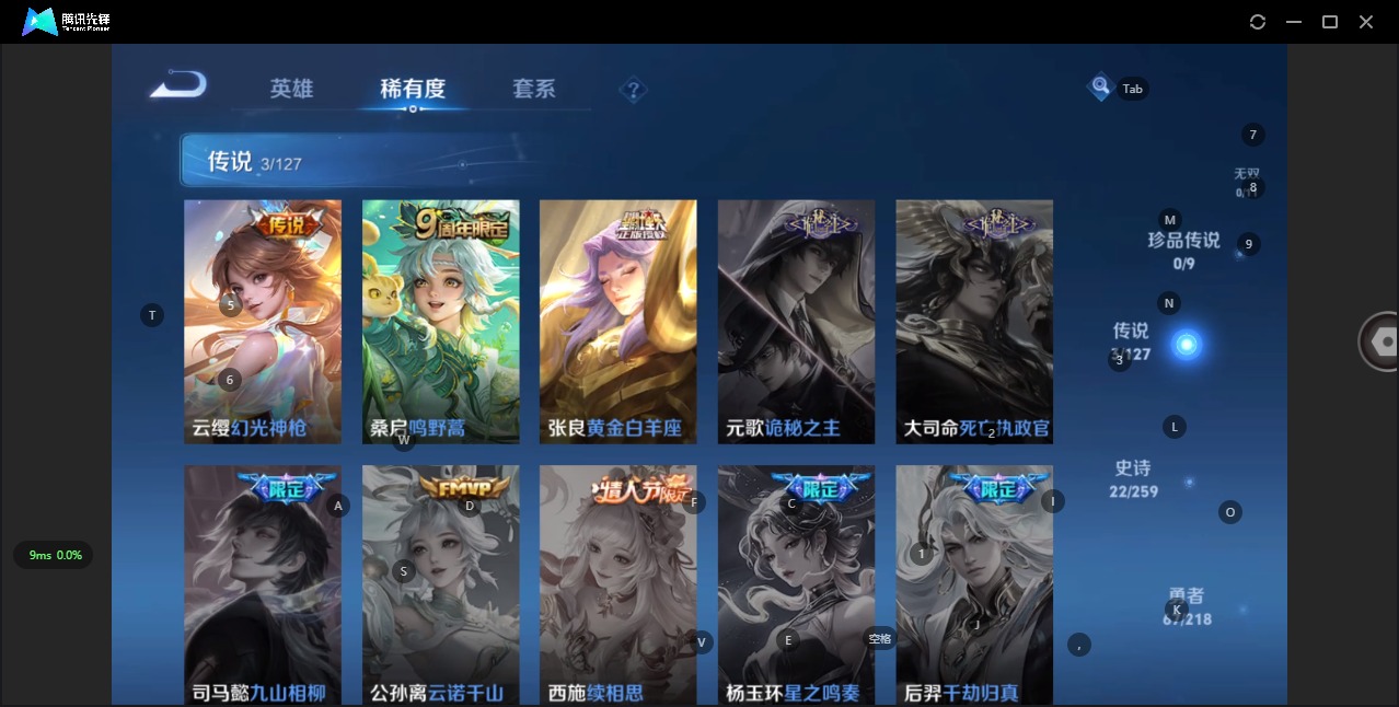 - [12219950]V5 1珍品传说 4传说 57英雄 37皮肤 可修改实名 优质装备:器灵·落星盏,游龙清影(小青龙),超时空战士-狄仁杰,千山共赴 限定皮:愿照·众生和(妲己年限) 史诗皮:化蝶舞,石田雨龙,百相守梦-黄忠,紫霞仙子,女仆咖啡,星夜王子,鬼剑武藏,诗语江南,鹰眼统帅