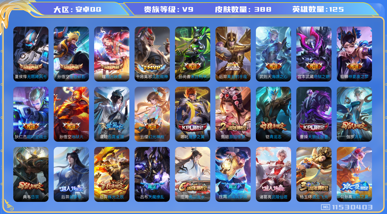 [11530403]V9 3典藏 18传说 125英雄 388皮肤 典藏英雄武则天 可修改实名 荣耀水晶:拾光映像(瑶典藏),全息碎影(猴子典藏),无限飓风号(高达) 传说皮:幻光神枪,黄金射手座,地狱火,仲夏夜之梦(大飞蛾),海洋之心,地狱之眼,末日机甲-孙尚香(绿蚂蚱),云霓雀翎,久胜战神,超时空战士-狄仁杰 珍宝阁皮:妄想食味,胡桃夹子,优雅恋人,玩趣恶龙 限定皮:鸣野蒿,白虎志(电光耗子),凤求凰(白切鸡),凤凰于飞,太华(伽罗年限),武陵仙君(小桃花),神威(电光马子),飞衡(韩信年限),瑞麟志(木兰年限),遇见飞天,高山流水,五谷丰年,青龙志(铠年限),冰锋战神,游园惊梦,梁祝,逐梦之翼,岱宗(典韦年限),天狼征服者,天狼绘梦者,李小龙,逐梦之光,朱雀志(守约年限),永曜之星,辉光之辰,如梦令-嫦娥,如梦令-后羿,猪悟能,天魔缭乱,青春决赛季,云端筑梦师,蜜橘之夏 史诗皮:星界战将,灵蛊蚀心,龙之律动,石田雨龙,蒙犽顽岩魄,蔬乡物语(鲁班七号),破空之剑,遇见神鹿,紫霞仙子,苍穹之光,电玩小子(小书包),白龙吟,黄金分割率,特工魅影,千年之狐,江河有灵,高渐离燃音魔法,百解令(蒙犽),蒙恬荣光圣徽,冰冠公主,偶像歌手,晚萤,无限星赏官,魅语,电玩·爆裂旋风,暗夜猫娘,龙骑士(小龙虾),末日机甲-吕布,猫狗日记-孙策,猫狗日记-大乔,乱世虎臣,节奏热浪,修罗,女仆咖啡,摇滚巨星,水果甜心,绅士熊喵,天才门将,星夜王子,心灵骇客,功夫厨神,德古拉伯爵,暗隐猎兽者,幽灵船长,鬼剑武藏,心灵战警,舞动绿茵,地狱岩魂,诗语江南,纤云弄巧,繁星吟游(呼啦呼啦),拒霜思,缤纷独角兽,乘风破浪,逐浪之夏,月团寄思,水晶猎龙者,曙光守护者,箭羽风息,金属风暴,原初追逐者,圣诞狂欢,圣诞恋歌,鹰眼统帅,暗夜贵公子,魅力维加斯,无心,未来纪元-赵云