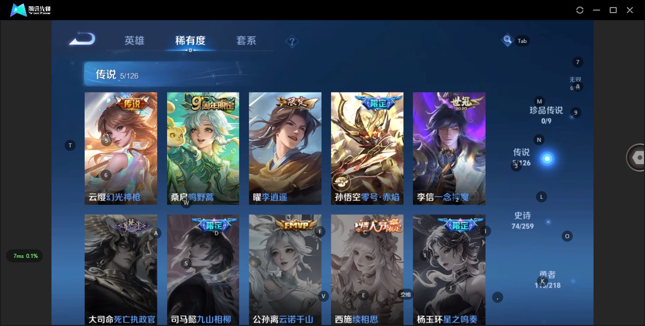 - [11297518]V8 1典藏 12传说 125英雄 349皮肤 可修改实名 优质装备:鸣剑·曳影,黄金狮子座,黄金射手座,冠军飞将,云鹰飞将(小将军),地狱火,零号·赤焰,李逍遥,澜逐花归海 珍宝阁皮:万物之道,优雅恋人,玩趣恶龙 限定皮:鸣野蒿,白虎志(电光耗子),傲雪梅枪,瑞麟志(木兰年限),高山流水,五谷丰年,青龙志(铠年限),冰锋战神,武圣,梁祝,李小龙,逐梦之影,玄武志(苏烈年限),朱雀志(守约年限),霸王别姬-项羽,默契交锋-花木兰,猪悟能,一生所爱,大圣娶亲,青春决赛季,冰霜恋舞曲,蜜橘之夏,寅虎·心曲(虎婆) 史诗皮:星界战将,龙之律动,蔬乡物语(鲁班七号),超元猎域,百相守梦-黄忠,紫霞仙子,苍穹之光,白龙吟,黄金分割率,特工魅影,电玩·爆裂旋风,百解令(蒙犽),蒙恬荣光圣徽,偶像歌手,暗夜猫娘,末日机甲-吕布,猫狗日记-孙策,乱世虎臣,节奏热浪,修罗,女仆咖啡,摇滚巨星,水果甜心,绅士熊喵,天才门将,星夜王子,心灵骇客,功夫厨神,德古拉伯爵,暗隐猎兽者,幽灵船长,鬼剑武藏,暗渊魔法,心灵战警,天秀·启明,地狱岩魂,纤云弄巧,繁星吟游(呼啦呼啦),拒霜思,缤纷独角兽,乘风破浪,逐浪之夏,水晶猎龙者,曙光守护者,热力回旋,金属风暴,原初追逐者,圣诞狂欢,圣诞恋歌,鹰眼统帅,暗夜贵公子,魅力维加斯,黎明之约,无心,未来纪元-赵云