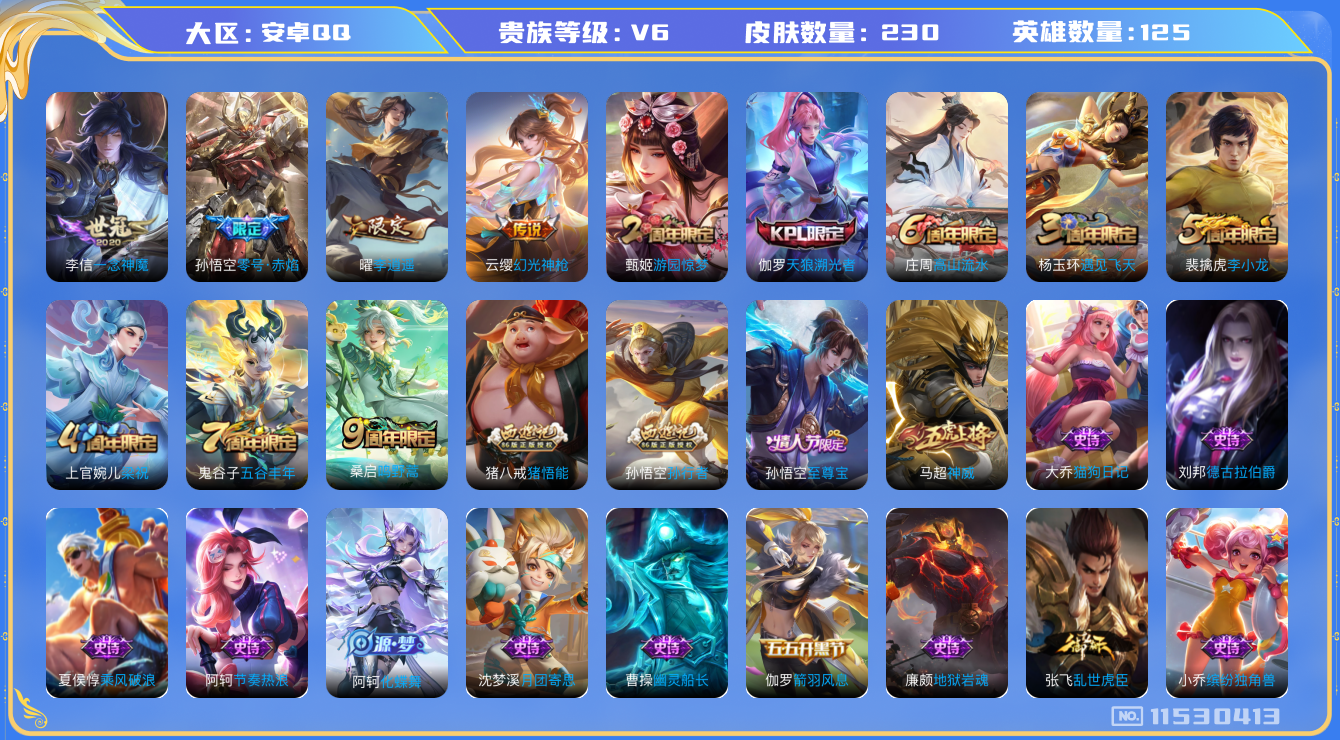 [11530413]V6 5传说 125英雄 230皮肤 可修改实名 优质装备:一念神魔,零号·赤焰,李逍遥 传说皮:幻光神枪 珍宝阁皮:妄想食味,女武神,玩趣恶龙 限定皮:鸣野蒿,至尊宝,神威(电光马子),遇见飞天,高山流水,五谷丰年,游园惊梦,梁祝,天狼溯光者,李小龙,孙行者,猪悟能 史诗皮:化蝶舞,星界战将,石田雨龙,紫霞仙子,黄金分割率,特工魅影,千年之狐,电玩·爆裂旋风,江河有灵,雪夜绮愿(周瑜),百解令(蒙犽),蒙恬荣光圣徽,魅语,冰冠公主,猫狗日记-孙策,猫狗日记-大乔,乱世虎臣,节奏热浪,女仆咖啡,摇滚巨星,水果甜心,天才门将,星夜王子,心灵骇客,时之奇旅-安琪拉,德古拉伯爵,暗隐猎兽者,幽灵船长,鬼剑武藏,心灵战警,地狱岩魂,拒霜思,缤纷独角兽,乘风破浪,逐浪之夏,月团寄思,水晶猎龙者,箭羽风息,金属风暴,原初追逐者,圣诞狂欢,圣诞恋歌,鹰眼统帅,暗夜贵公子,魅力维加斯,黎明之约,无心,未来纪元-赵云