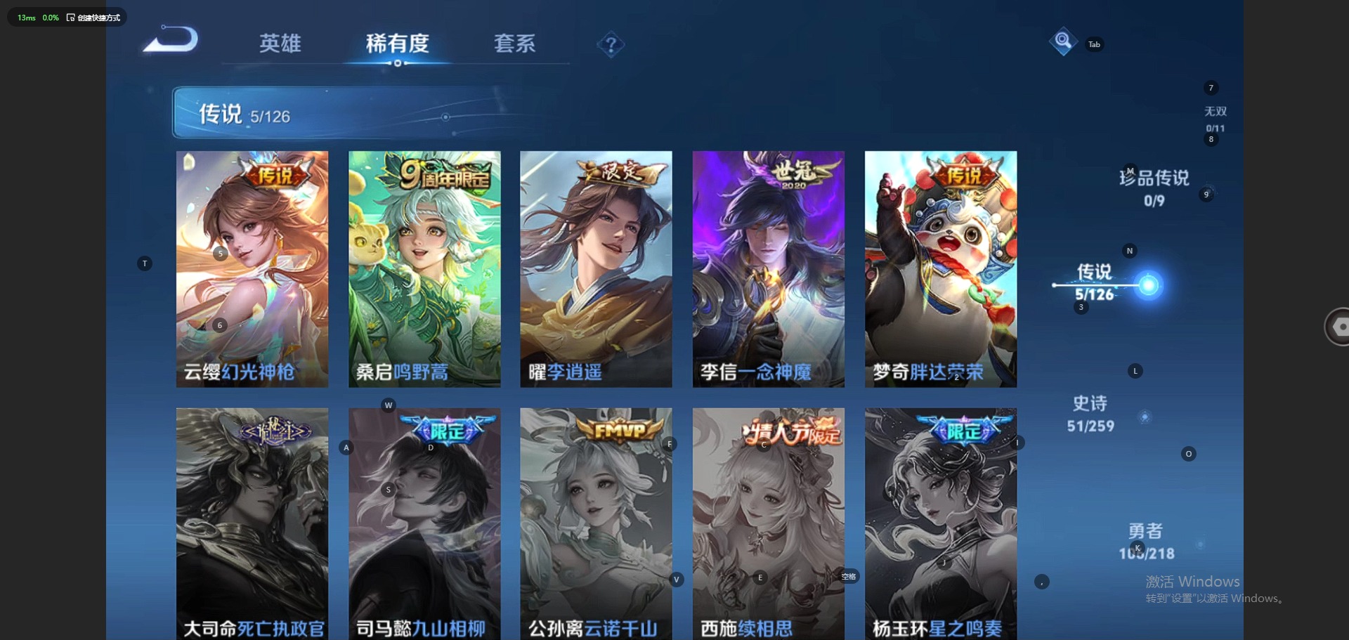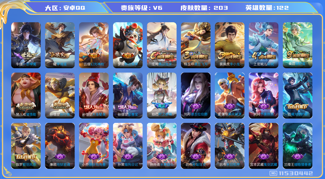 [11530442]V6 5传说 122英雄 203皮肤 可修改实名 优质装备:一念神魔,胖达荣荣,李逍遥 传说皮:幻光神枪 珍宝阁皮:胡桃夹子,蔷薇恋人 限定皮:鸣野蒿,至尊宝,时之彼端,遇见飞天,高山流水,梁祝,李小龙,孙行者,猪悟能,大圣娶亲 史诗皮:千年之狐,蒙恬荣光圣徽,偶像歌手,龙骑士(小龙虾),晚萤,末日机甲-吕布,猫狗日记-孙策,节奏热浪,修罗,女仆咖啡,水果甜心,功夫厨神,德古拉伯爵,暗隐猎兽者,鬼剑武藏,舞动绿茵,地狱岩魂,纤云弄巧,拒霜思,缤纷独角兽,乘风破浪,水晶猎龙者,曙光守护者,箭羽风息,金属风暴,原初追逐者,圣诞狂欢,鹰眼统帅,魅力维加斯,黎明之约,未来纪元-赵云