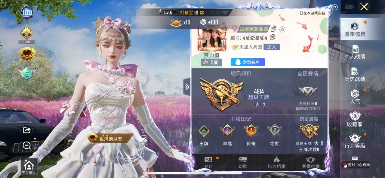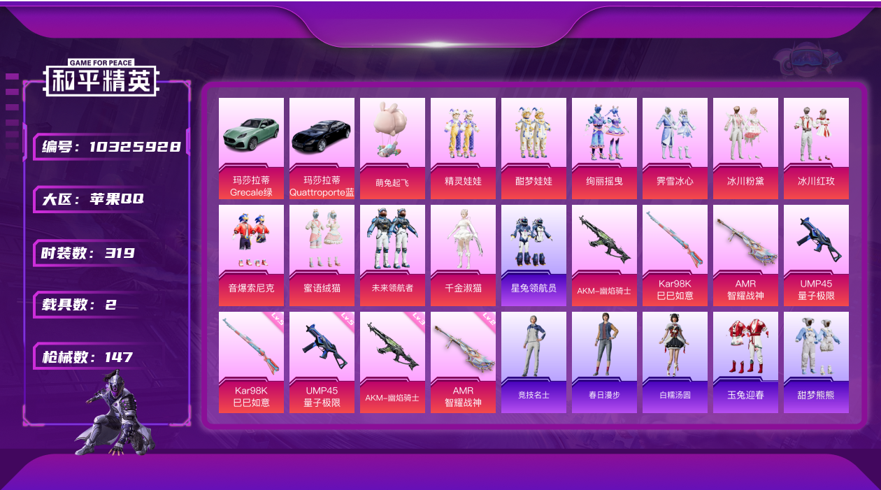 [10325928]10粉装 4特效枪 2载具 6印记 可二次 可修改实名 时装数:319 枪械数:147 战备数:2 热门装扮:未来领航者,千金淑猫,精灵娃娃,酣梦娃娃,绚丽摇曳,霁雪冰心,冰川粉黛,冰川红玫,音爆索尼克,蜜语绒猫,星兔领航员 载具:玛莎拉蒂Quattroporte(夜幕蓝),玛莎拉蒂Grecale(薄荷绿),僚机-萌兔起飞 稀有枪皮:Kar98K-巳巳如意,AMR-智耀战神,UMP45量子极限,AKM-幽焰骑士 五级特效枪:五级UMP45-量子极限,五级Kar98K-巳巳如意 三级特效枪:三级AKM-幽焰骑士 二级特效枪:二级AMR-智耀战神 紫色装扮:湖畔霞光,粉日山川,小熊娃娃,雏菊兔兔,萝兰蝴蝶,SS29特训,SS28特训,听雨铃兰,燕燕于飞,鱼渊荷华,玉兔迎春,黑曜寓言,裁决天象,星途旅人,青团波波,糖糖葫芦,棉花软糖,竞技名士,都市丽猫,摩登魅猫,街头风暴,甜梦熊熊,元气发射,SS27特训,晨曦轻云,蓝冰羽,紫幽梦,SS32特训服(SS32特训套装),春日漫步,恋语绒绒,晶灵使者,白糯汤圆,糖霜甜心 优质战备:绮梦流光降落伞,深渊漩涡飞行器,金丰海韵降落伞,橘柚倾心降落伞,曦光华影飞行器,智耀战神降落伞,信仰神谕降落伞,信仰神谕飞行器,牡丹亭·游园飞行器,千金淑猫降落伞,甜蜜草莓降落伞,冰川粉黛降落伞,海螺星光降落伞,全功率超战飞行器,启明星降落伞,圣光天使降落伞,飒粉甜心降落伞,梦幻火箭降落伞,甜蜜誓约降落伞,甜心娃娃降落伞,暗星紫秘降落伞 二级优质战备:二级信仰神谕飞行器