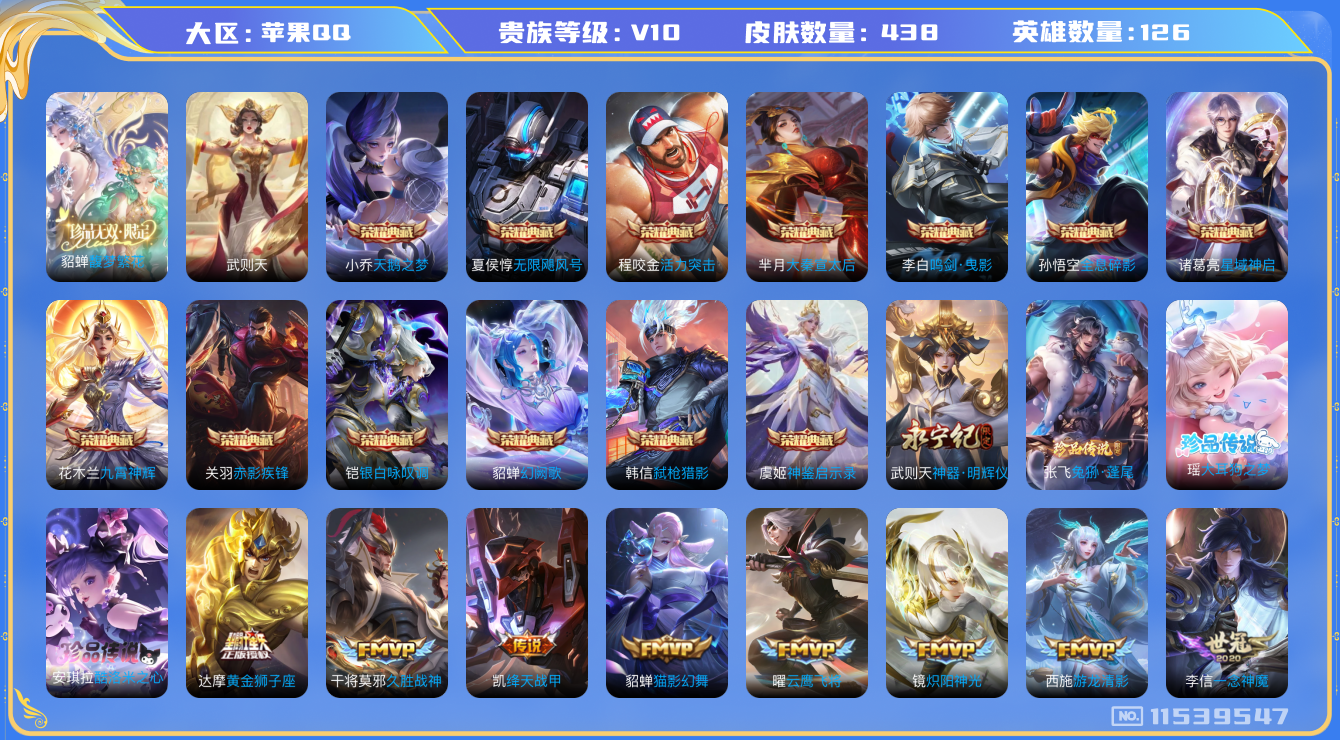 [11539547]【商品标题】:苹果Q-V10-最强王者段位-126英雄-438皮肤-13典藏-1珍品无双-1无双-3珍品传说-66传说-135史诗