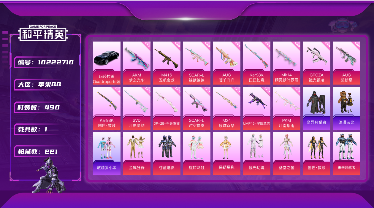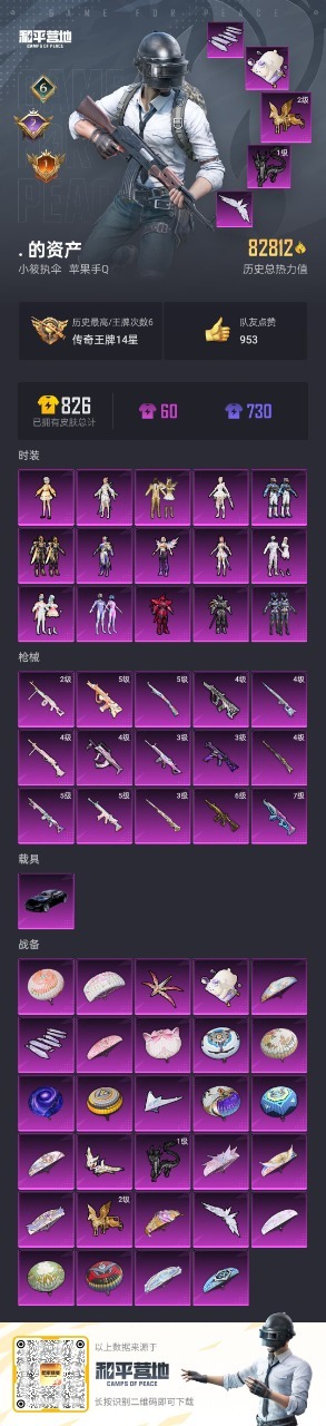 - PX_2100093- 苹果手Q-14王牌印记-6粉装-5特效枪-1载具-56591热力值-155套装-168枪皮-0卓越印记-0传奇印记 【6粉装】,宝贝奶油派,天使彩虹糖,蝶舞迷情,智耀战神,铁血龙王,快乐主宰 【5特效枪】AKM-绿萝繁花-5级 SCAR-L-锦绣绵绵-5级 M416-五爪金龙-7级 Kar98K-巳巳如意-5级 MG3-洛神天依-7级 【7稀有紫装】,奇异狩猎者,雪山精英