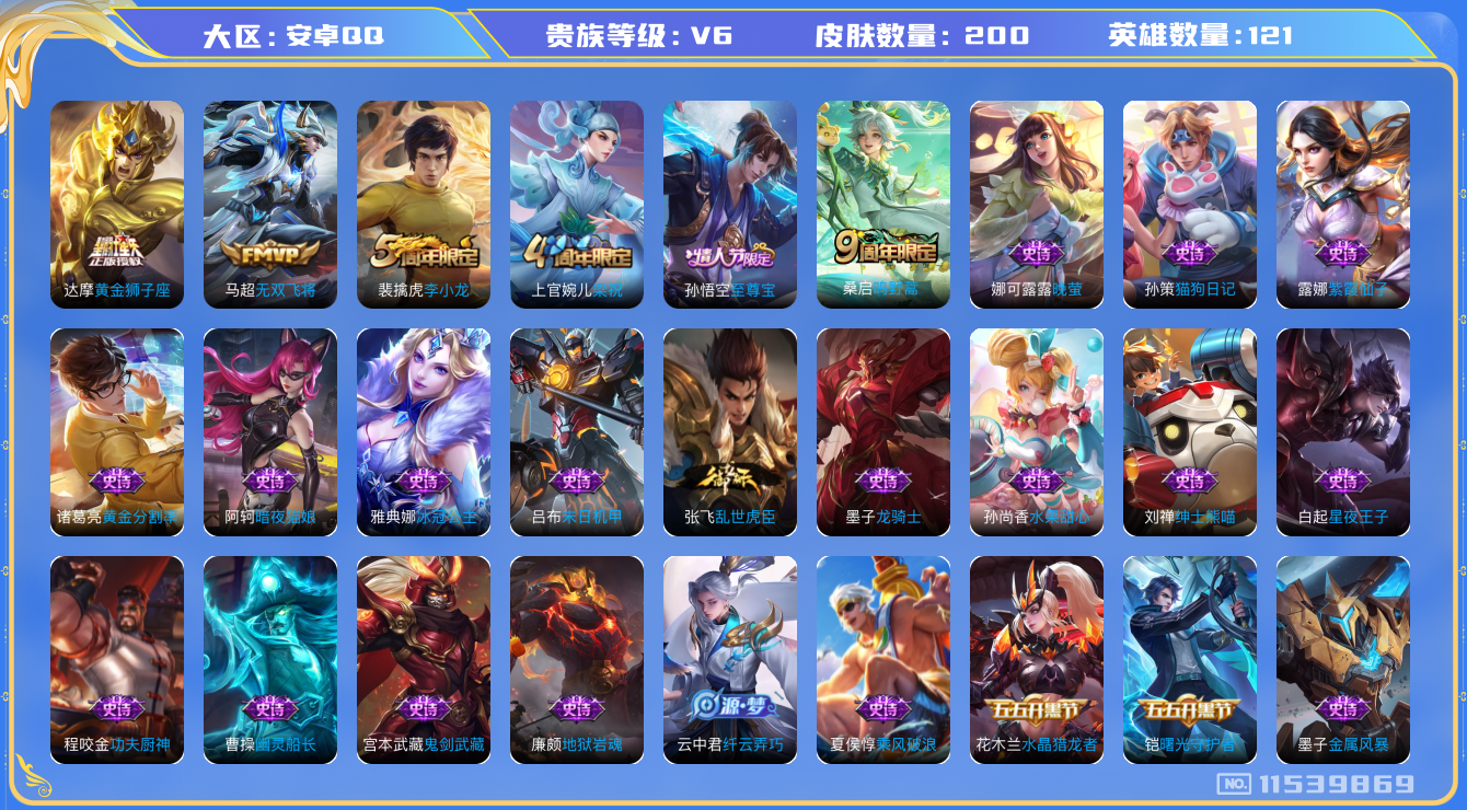 [11539869]【商品标题】:安卓Q-V0-最强王者段位-120英雄-200皮肤-0典藏-0珍品无双-0无双-0珍品传说-3传说-46史诗