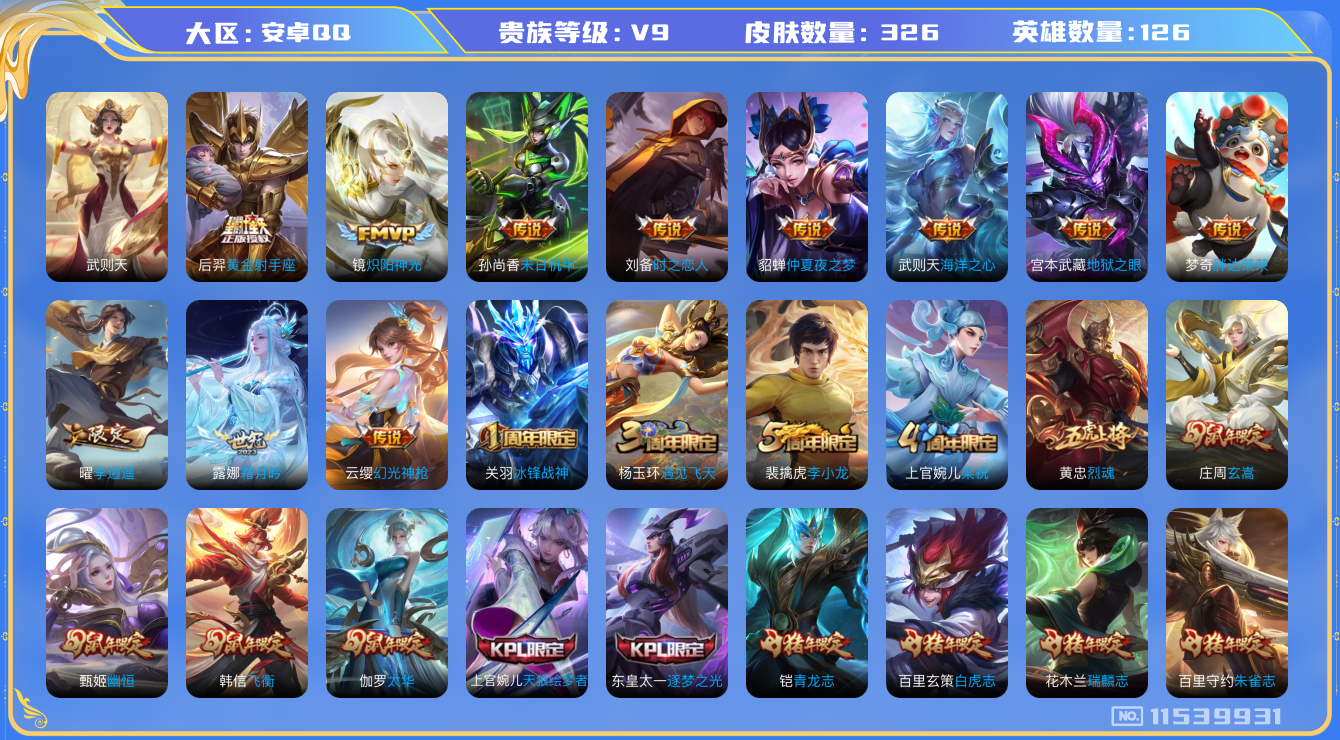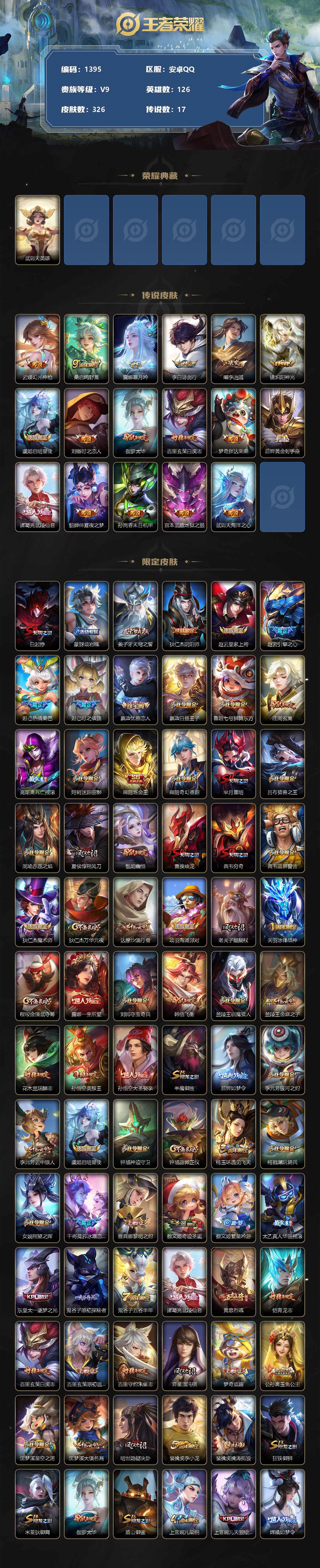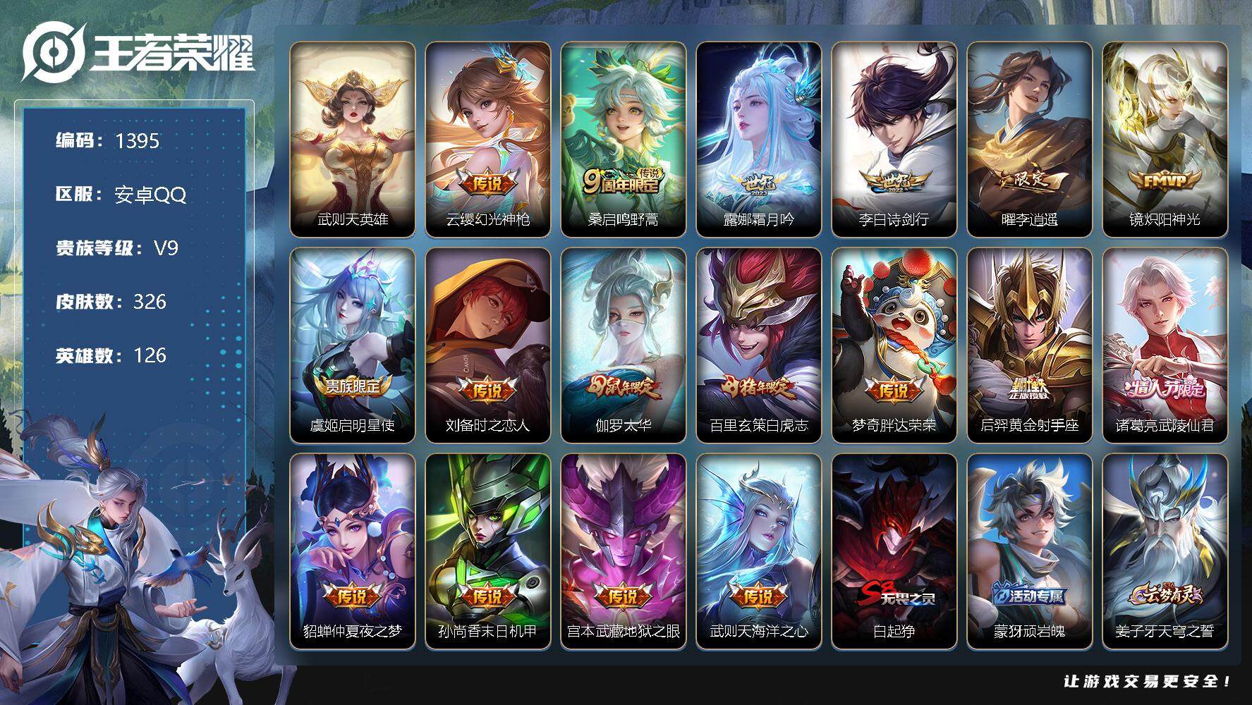 [11539931]【商品标题】:安卓Q-V8-最强王者段位-126英雄-326皮肤-0典藏-0珍品无双-0无双-0珍品传说-17传说-95史诗