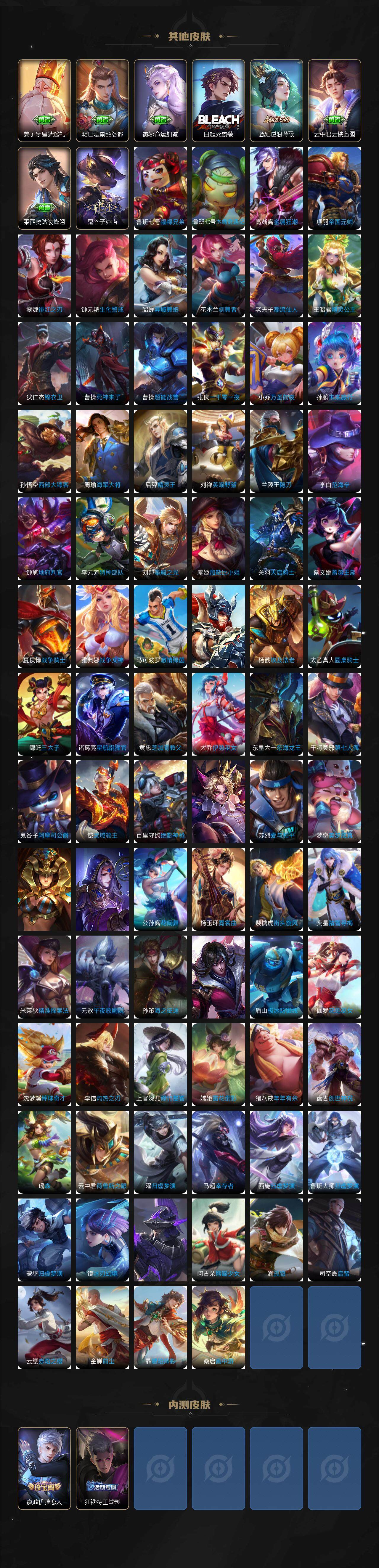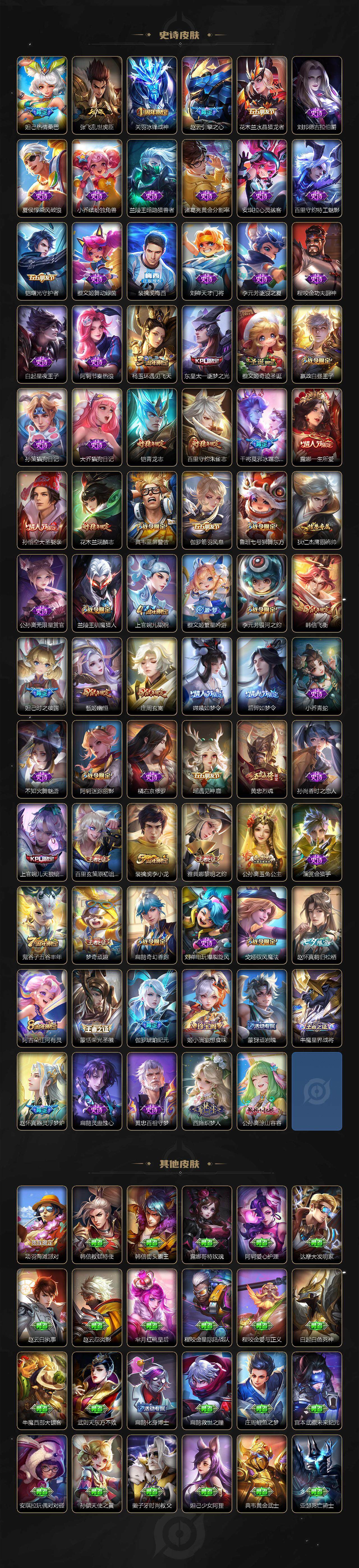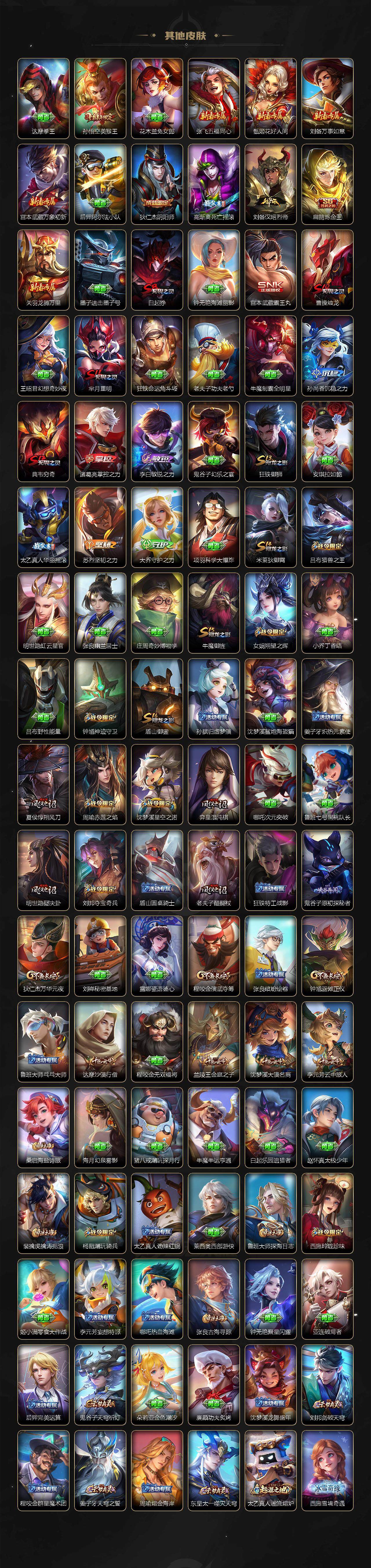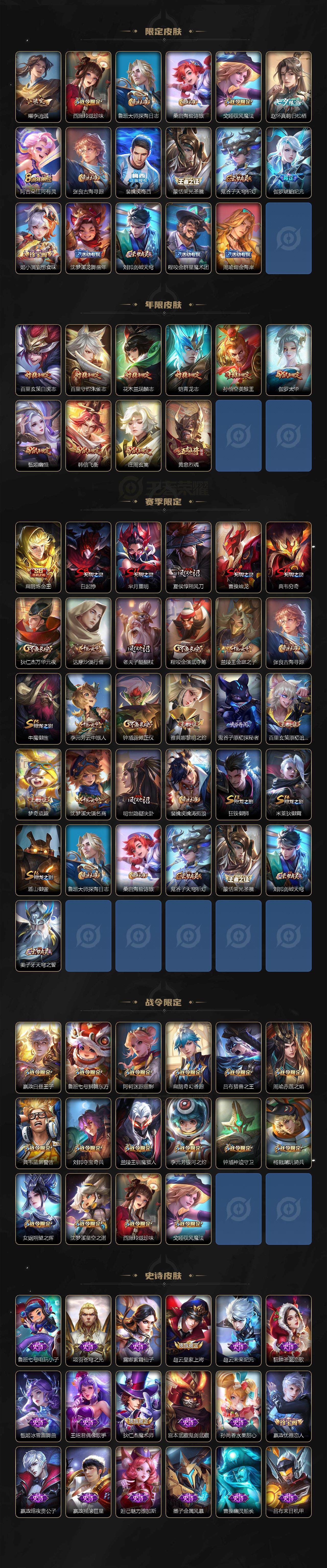 【限定皮肤】:白起狰,蒙犽顽岩魄,姜子牙天穹之誓,狄仁杰阴阳师,赵云皇家上将,赵云引擎之心,妲己热情桑巴,妲己时之彼端,嬴政优雅恋人,嬴政白昼王子,鲁班七号狮舞东方,庄周玄嵩,高渐离死亡摇滚,阿轲迷踪丽影,扁鹊炼金王,扁鹊奇幻香踪,芈月重明,吕布猎兽之王,周瑜赤莲之焰,夏侯惇朔风刀,甄姬幽恒,曹操烛龙,典韦穷奇,典韦蓝屏警告,狄仁杰魔术师,狄仁杰万华元夜,达摩沙漠行僧,项羽海滩派对,老夫子醍醐杖,关羽冰锋战神,程咬金演武夺筹,露娜一生所爱,刘邦夺宝奇兵,韩信飞衡,兰陵王驯魔猎人,兰陵王金庭之子,花木兰瑞麟志,孙悟空美猴王,孙悟空大圣娶亲,牛魔御旌,后羿如梦令,李元芳银河之约,李元芳云中旅人,虞姬启明星使,钟馗神迹守卫,钟馗驱傩正仪,杨玉环遇见飞天,杨戬潮玩骑兵,女娲朔望之晖,干将莫邪冰霜恋舞曲,雅典娜黎明之约,蔡文姬奇迹圣诞,蔡文姬繁星吟游,太乙真人华丽摇滚,东皇太一逐梦之光,鬼谷子原初探秘者,鬼谷子五谷丰年,诸葛亮武陵仙君,黄忠烈魂,铠青龙志,百里玄策白虎志,百里玄策原初追逐者,百里守约朱雀志,弈星混沌棋,梦奇顽趣,公孙离玉兔公主,沈梦溪星空之诺,沈梦溪大漠名商,明世隐疑决卦,裴擒虎李小龙,裴擒虎擒涛扼浪,狂铁御狮,米莱狄御霄,伽罗太华,盾山御銮,上官婉儿梁祝,上官婉儿天狼绘梦者,嫦娥如梦令,曜李逍遥 ,西施玲珑珍味,鲁班大师探海日志,桑启海盐诗旅,戈娅驭风魔法,赵怀真鹤归松栖,阿古朵江河有灵,张良古海寻踪,裴擒虎梅西,蒙恬荣光圣徽,鬼谷子天穹祈灯,伽罗琥珀纪元,姬小满妄想食味,沈梦溪龙舞盛年,刘邦剑破天穹,程咬金群星魔术团,周瑜熔金海岸