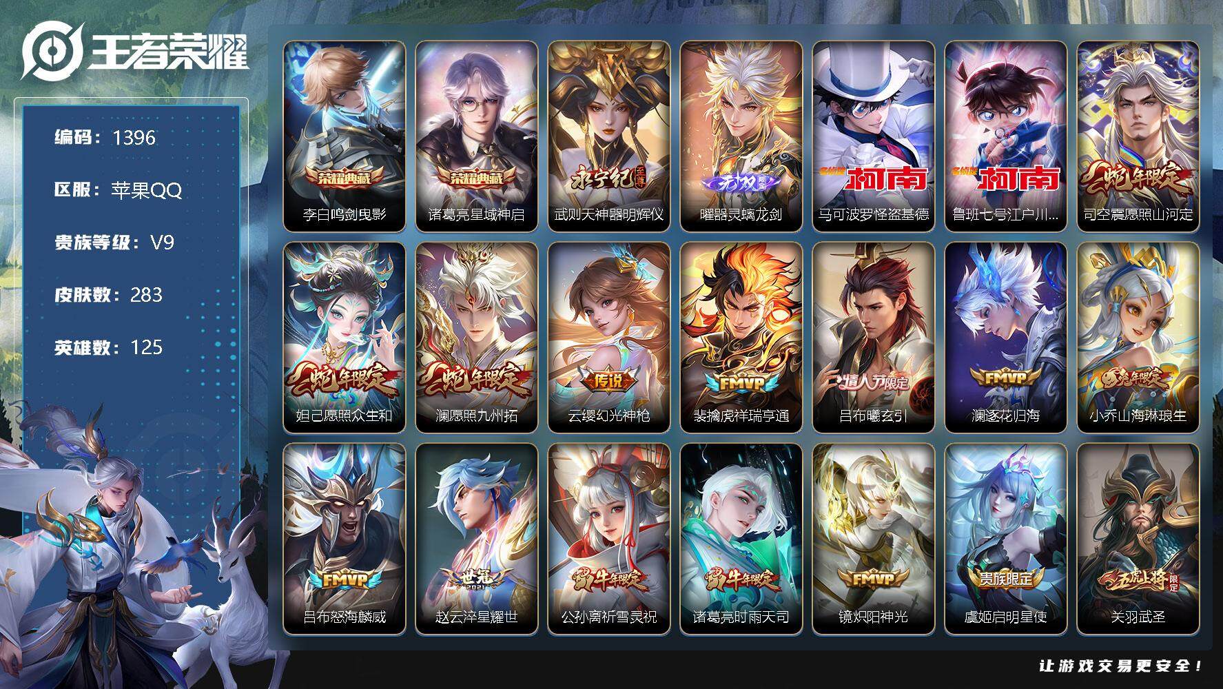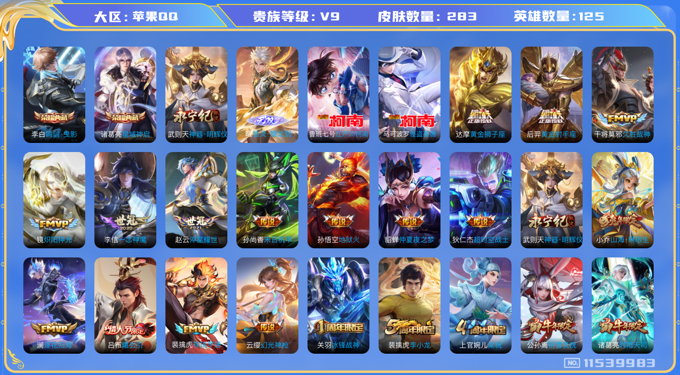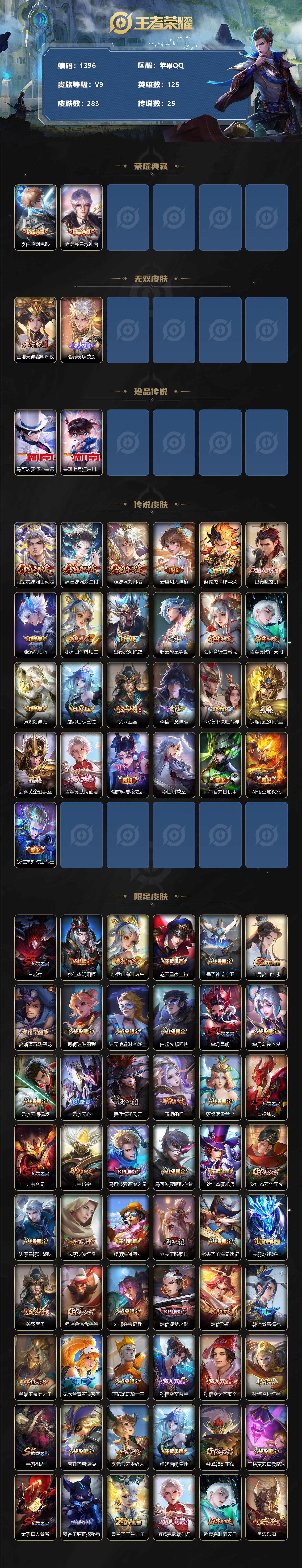 [11539983]【商品标题】:苹果Q-V9-最强王者段位-125英雄-283皮肤-2典藏-0珍品无双-2无双-2珍品传说-25传说-84史诗