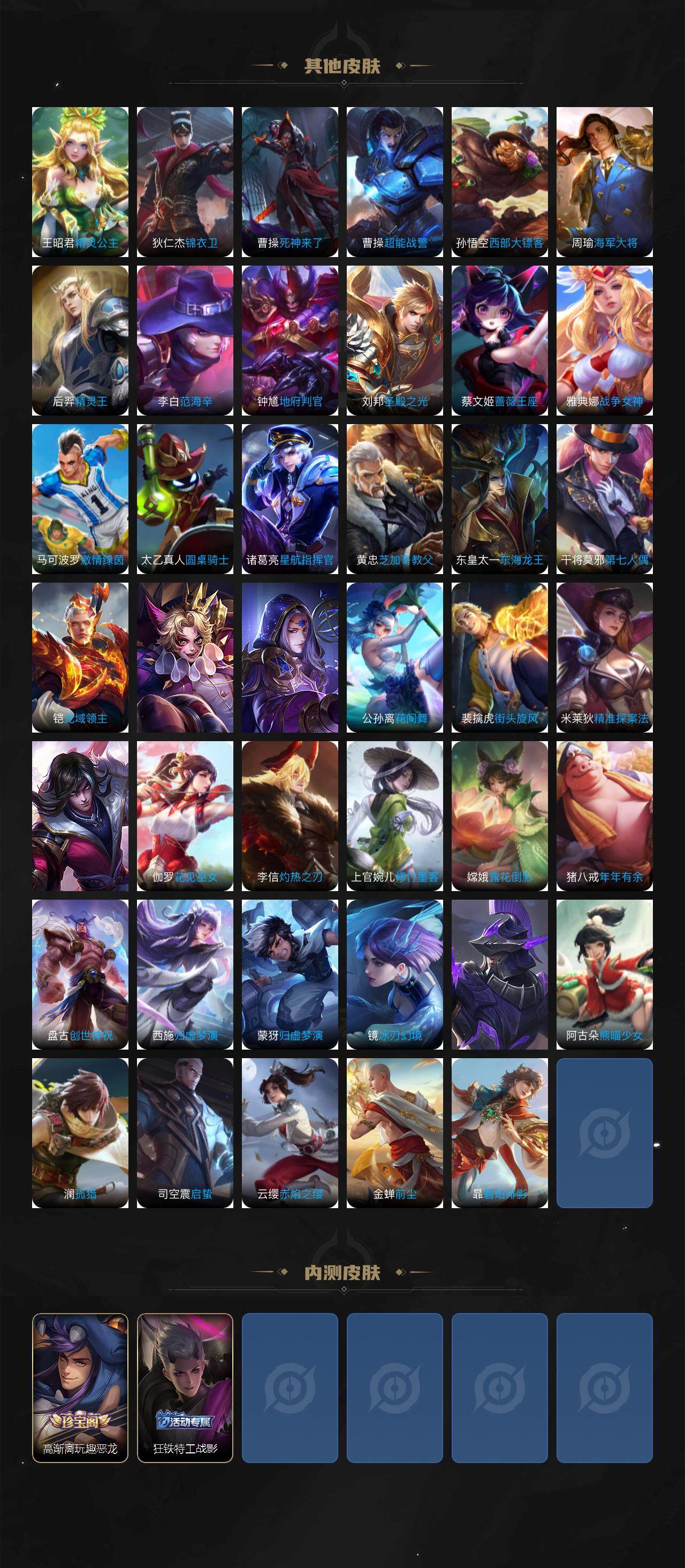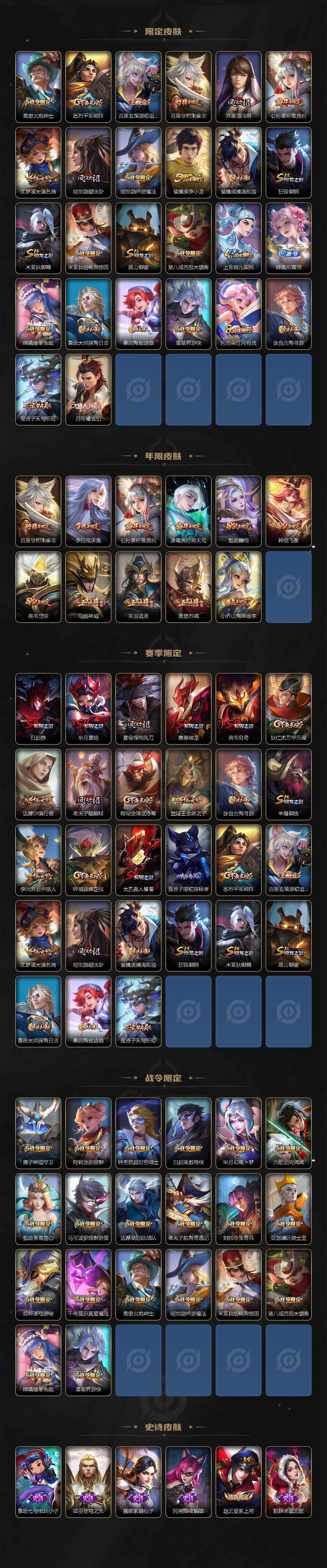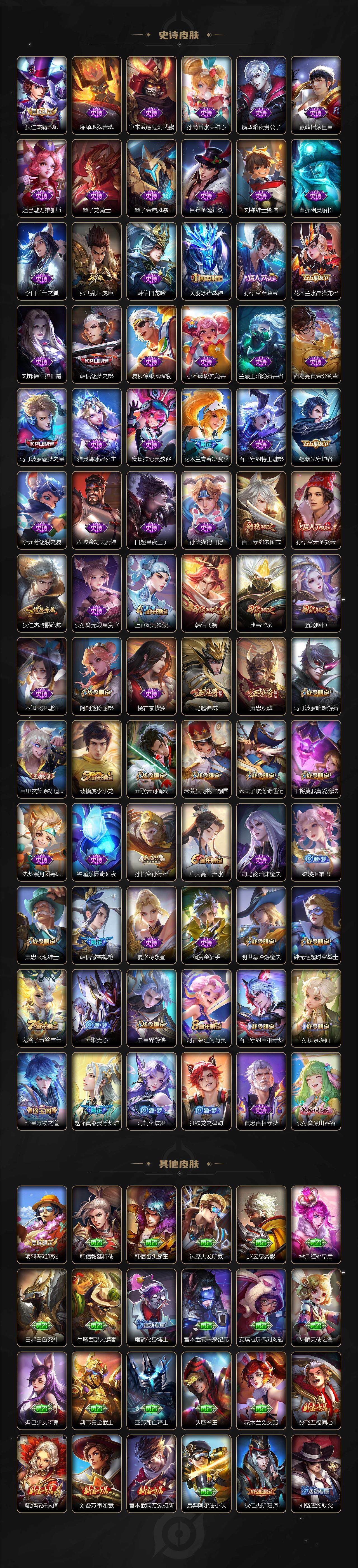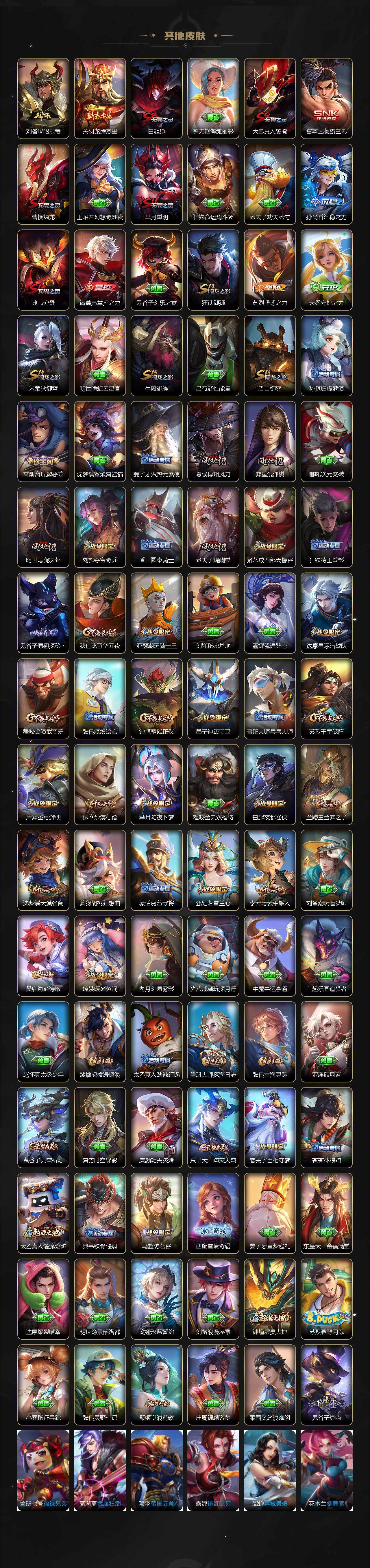 【限定皮肤】:白起狰,狄仁杰阴阳师,小乔山海琳琅生,赵云皇家上将,墨子神迹守卫,庄周高山流水,高渐离玩趣恶龙,阿轲迷踪丽影,钟无艳超时空战士,白起夜都怪侠,芈月重明,芈月幻夜卜梦,元歌云间偶戏,元歌无心,夏侯惇朔风刀,甄姬幽恒,甄姬落雪兰心,曹操烛龙,典韦穷奇,典韦岱宗,马可波罗逐梦之星,马可波罗暗影游猎,狄仁杰魔术师,狄仁杰万华元夜,达摩星际陆战队,达摩沙漠行僧,项羽海滩派对,老夫子醍醐杖,老夫子航海奇遇记,关羽冰锋战神,关羽武圣,程咬金演武夺筹,刘邦夺宝奇兵,韩信逐梦之影,韩信飞衡,韩信傲雪梅枪,兰陵王金庭之子,花木兰青春决赛季,亚瑟潮玩骑士王,孙悟空至尊宝,孙悟空大圣娶亲,孙悟空孙行者,牛魔御旌,后羿圣弓游侠,李元芳云中旅人,虞姬启明星使,钟馗驱傩正仪,干将莫邪真爱魔法,太乙真人饕餮,鬼谷子原初探秘者,鬼谷子五谷丰年,诸葛亮武陵仙君,诸葛亮时雨天司,黄忠烈魂,黄忠火炮绅士,苏烈千军破阵,百里玄策原初追逐者,百里守约朱雀志,弈星混沌棋,公孙离祈雪灵祝,沈梦溪大漠名商,明世隐疑决卦,明世隐吟游魔法,裴擒虎李小龙,裴擒虎擒涛扼浪,狂铁御狮,米莱狄御霄,米莱狄胡桃异想国,盾山御銮,猪八戒西部大镖客,上官婉儿梁祝,嫦娥拒霜思,嫦娥暖冬兔眠,鲁班大师探海日志,桑启海盐诗旅,暃星界游侠,阿古朵江河有灵,张良古海寻踪,鬼谷子天穹祈灯,吕布曦玄引