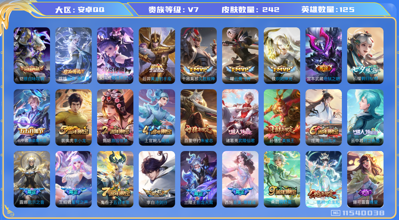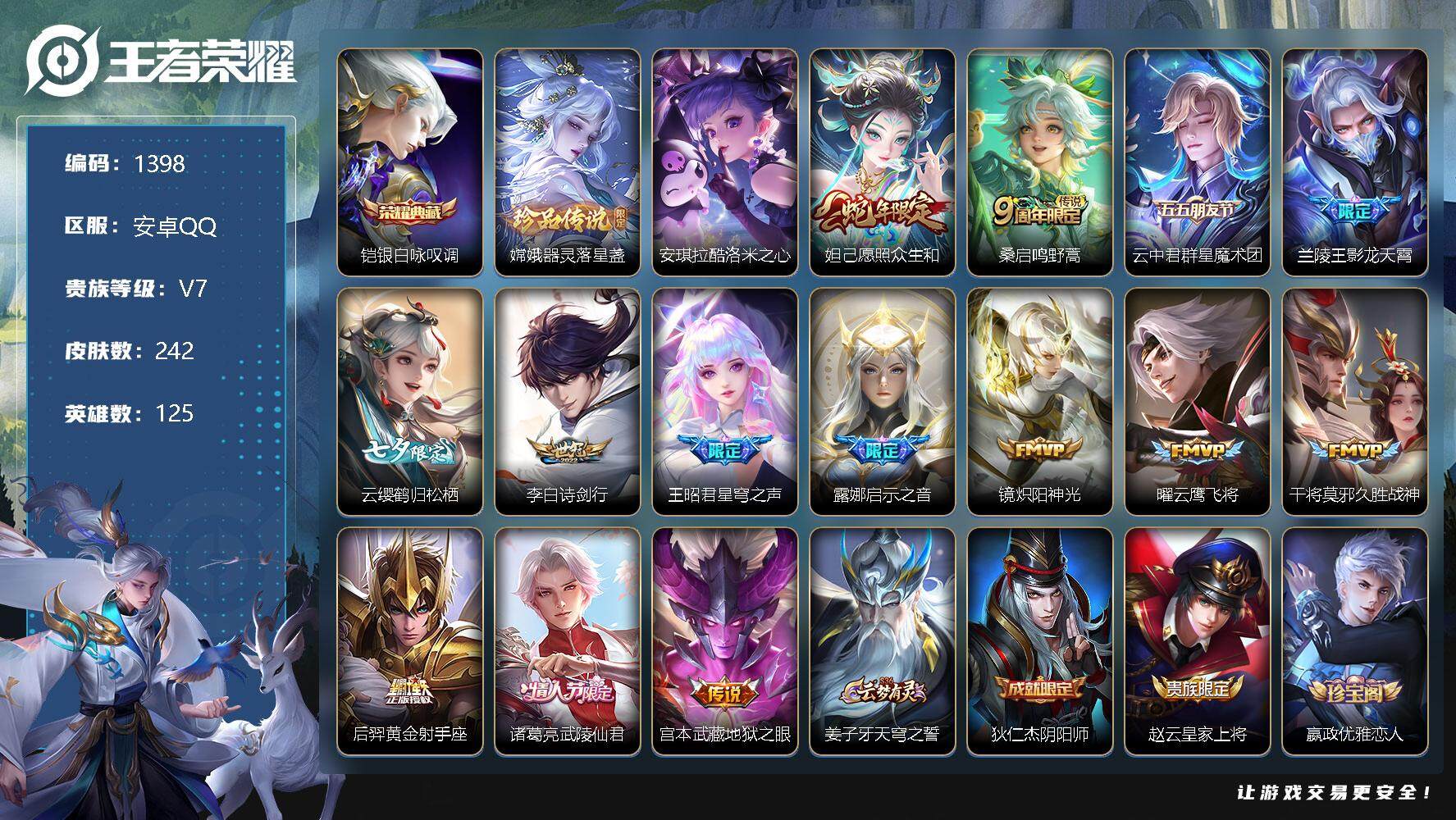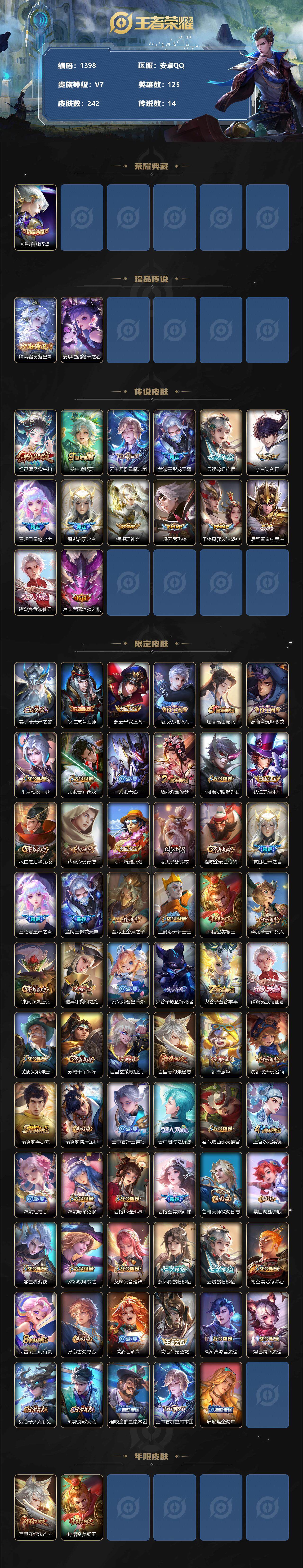 [11540038]【商品标题】:安卓Q-V7-最强王者段位-125英雄-242皮肤-1典藏-0珍品无双-0无双-2珍品传说-14传说-76史诗