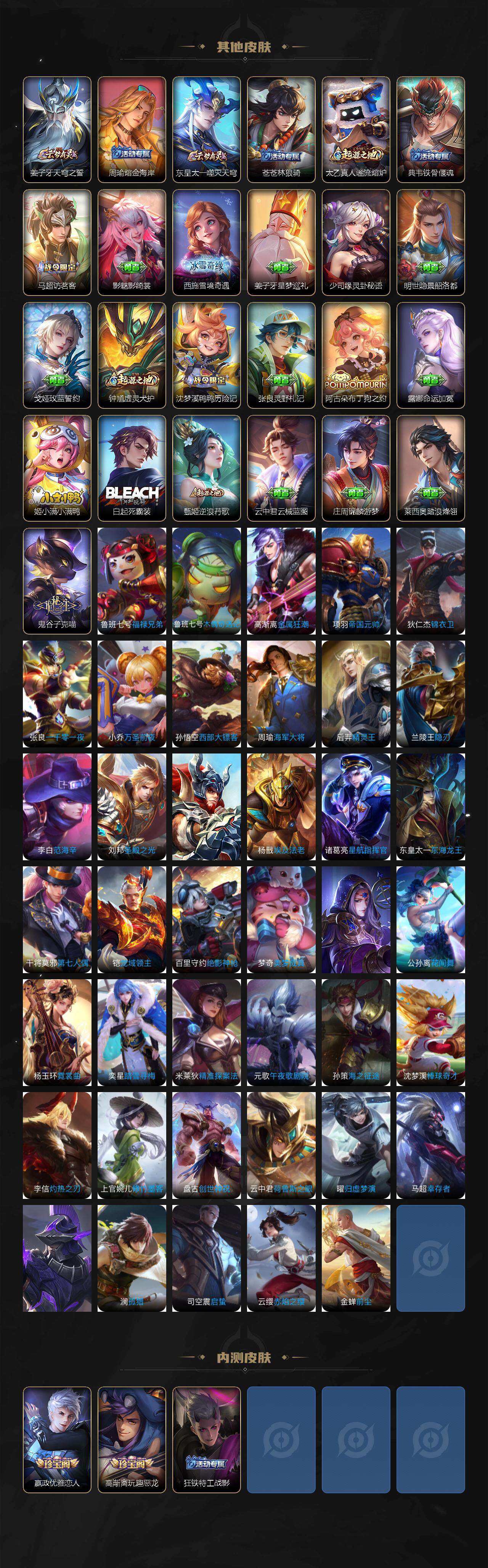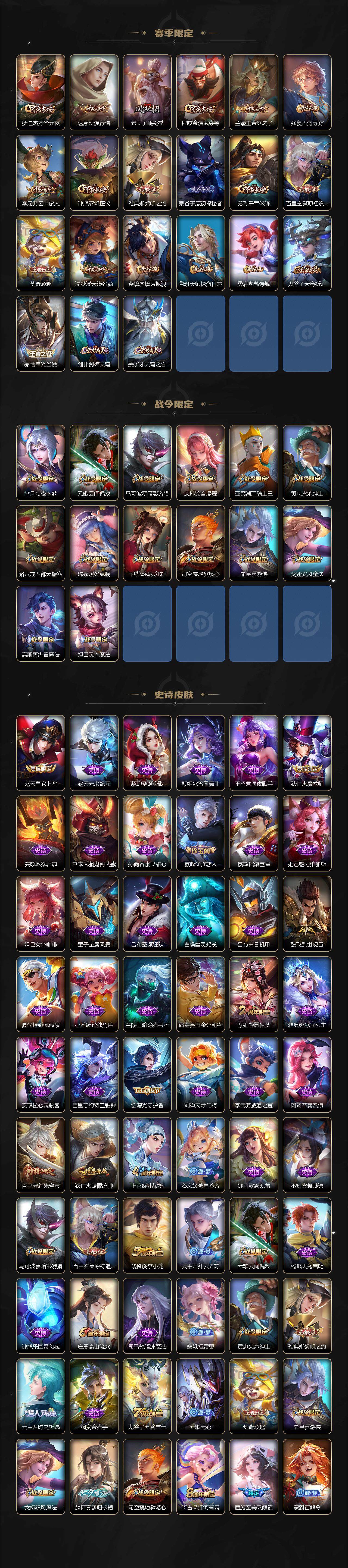【限定皮肤】:姜子牙天穹之誓,狄仁杰阴阳师,赵云皇家上将,嬴政优雅恋人,庄周高山流水,高渐离玩趣恶龙,芈月幻夜卜梦,元歌云间偶戏,元歌无心,甄姬游园惊梦,马可波罗暗影游猎,狄仁杰魔术师,狄仁杰万华元夜,达摩沙漠行僧,项羽海滩派对,老夫子醍醐杖,程咬金演武夺筹,露娜启示之音,王昭君星穹之声,兰陵王影龙天霄,兰陵王金庭之子,亚瑟潮玩骑士王,孙悟空美猴王,李元芳云中旅人,钟馗驱傩正仪,雅典娜黎明之约,蔡文姬繁星吟游,鬼谷子原初探秘者,鬼谷子五谷丰年,诸葛亮武陵仙君,黄忠火炮绅士,苏烈千军破阵,百里玄策原初追逐者,百里守约朱雀志,梦奇顽趣,沈梦溪大漠名商,裴擒虎李小龙,裴擒虎擒涛扼浪,云中君纤云弄巧,云中君时之祈愿,猪八戒西部大镖客,上官婉儿梁祝,嫦娥拒霜思,嫦娥暖冬兔眠,西施玲珑珍味,西施至美乘鲤谣,鲁班大师探海日志,桑启海盐诗旅,暃星界游侠,戈娅驭风魔法,艾琳流音漫舞,赵怀真鹤归松栖,云缨鹤归松栖,司空震地狱燃心,阿古朵江河有灵,张良古海寻踪,蒙犽百解令,蒙恬荣光圣徽,高渐离燃音魔法,妲己灵卜魔法,鬼谷子天穹祈灯,刘邦剑破天穹,程咬金群星魔术团,云中君群星魔术团,周瑜熔金海岸