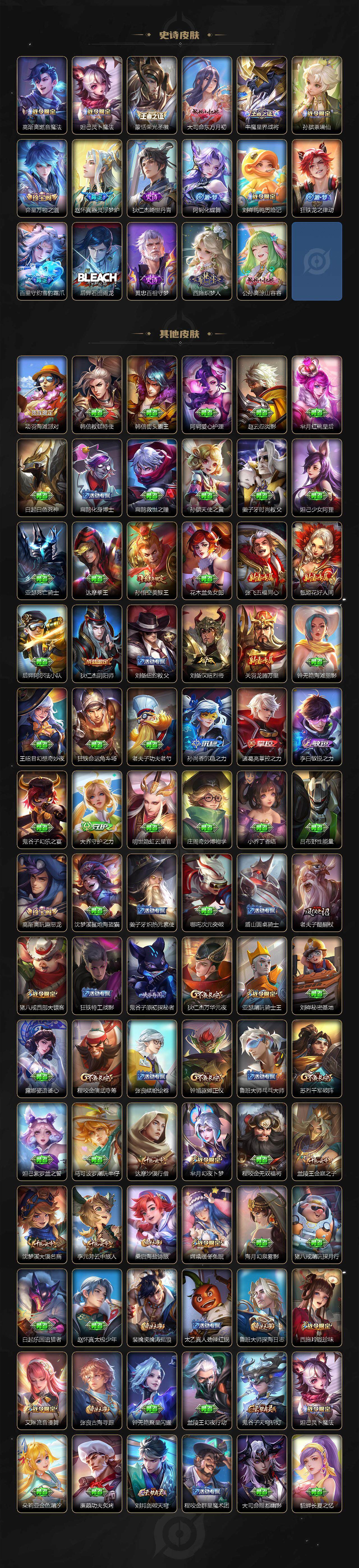- [11607935]V7 1典藏 1传说 123英雄 171皮肤 可修改实名 优质装备:全息碎影(猴子典藏) 珍宝阁皮:妄想食味,蔷薇恋人,玩趣恶龙 限定皮:鸣野蒿,至尊宝,高山流水,五谷丰年,李小龙,辉光之辰,大圣娶亲 史诗皮:苍穹之光,电玩小子(小书包),特工魅影,冰冠公主,偶像歌手,龙骑士(小龙虾),猫狗日记-孙策,乱世虎臣,节奏热浪,女仆咖啡,摇滚巨星,水果甜心,功夫厨神,德古拉伯爵,暗隐猎兽者,幽灵船长,鬼剑武藏,逐浪之夏,曙光守护者,金属风暴,鹰眼统帅,魅力维加斯,未来纪元-赵云