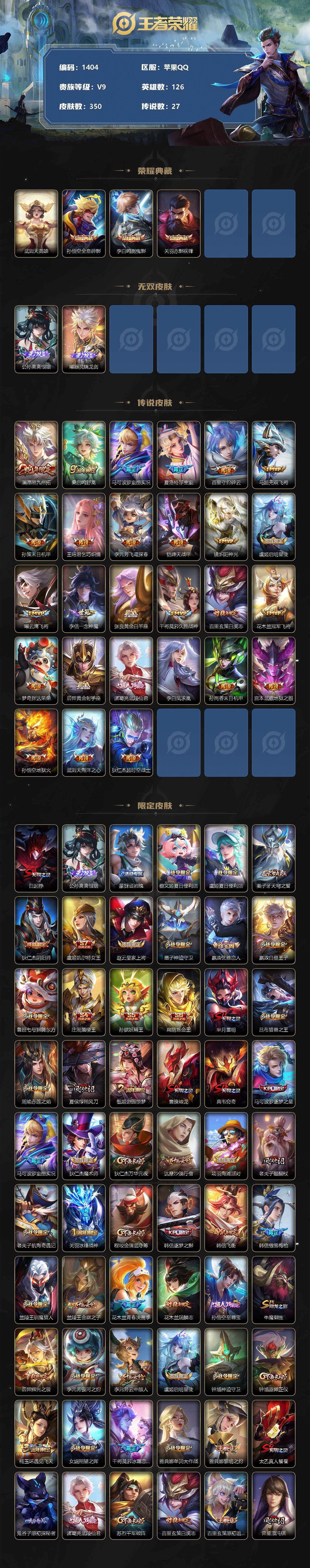 - [12176966]V7 1珍品传说 16传说 125英雄 259皮肤 可修改实名 女号 优质装备:怪盗基德,云鹰飞将(小将军),久胜战神,一念神魔,仲夏夜之梦(大飞蛾),时之恋人-刘备(电焊工),无双飞将,浮生妄,霜月吟,琥珀纪元马超,涂山容容 传说皮:貂蝉曦玄引,祥瑞亨通,幻光神枪 珍宝阁皮:妄想食味,玩趣恶龙 限定皮:愿照·九州拓(澜年限),愿照·山河定(司空震年限),逐霄战戟,陌上桑,鸣野蒿,神威(电光马子),齐天大圣,五谷丰年,梁祝,李小龙,山海·玄木吟(马可年限) 史诗皮:鸭鸭历险记-刘禅,化蝶舞,龙之律动,石田雨龙,百相守梦-周瑜,茶境仙,百相守梦-黄忠,破空之剑,蒙犽顽岩魄,百相守梦-百里守约,紫霞仙子,黄金分割率,特工魅影,永昼,江河有灵,百解令(蒙犽),高渐离燃音魔法,电玩·爆裂旋风,无限星赏官,偶像歌手,猫狗日记-孙策,猫狗日记-大乔,乱世虎臣,女仆咖啡,摇滚巨星,水果甜心,星夜王子,德古拉伯爵,暗隐猎兽者,幽灵船长,鬼剑武藏,天秀·启明,纤云弄巧,拒霜思,缤纷独角兽,乘风破浪,水晶猎龙者,曙光守护者,箭羽风息,金属风暴,鹰眼统帅,魅力维加斯,赏金猎手,滕王阁序,无心,未来纪元-赵云,玫瑰异探