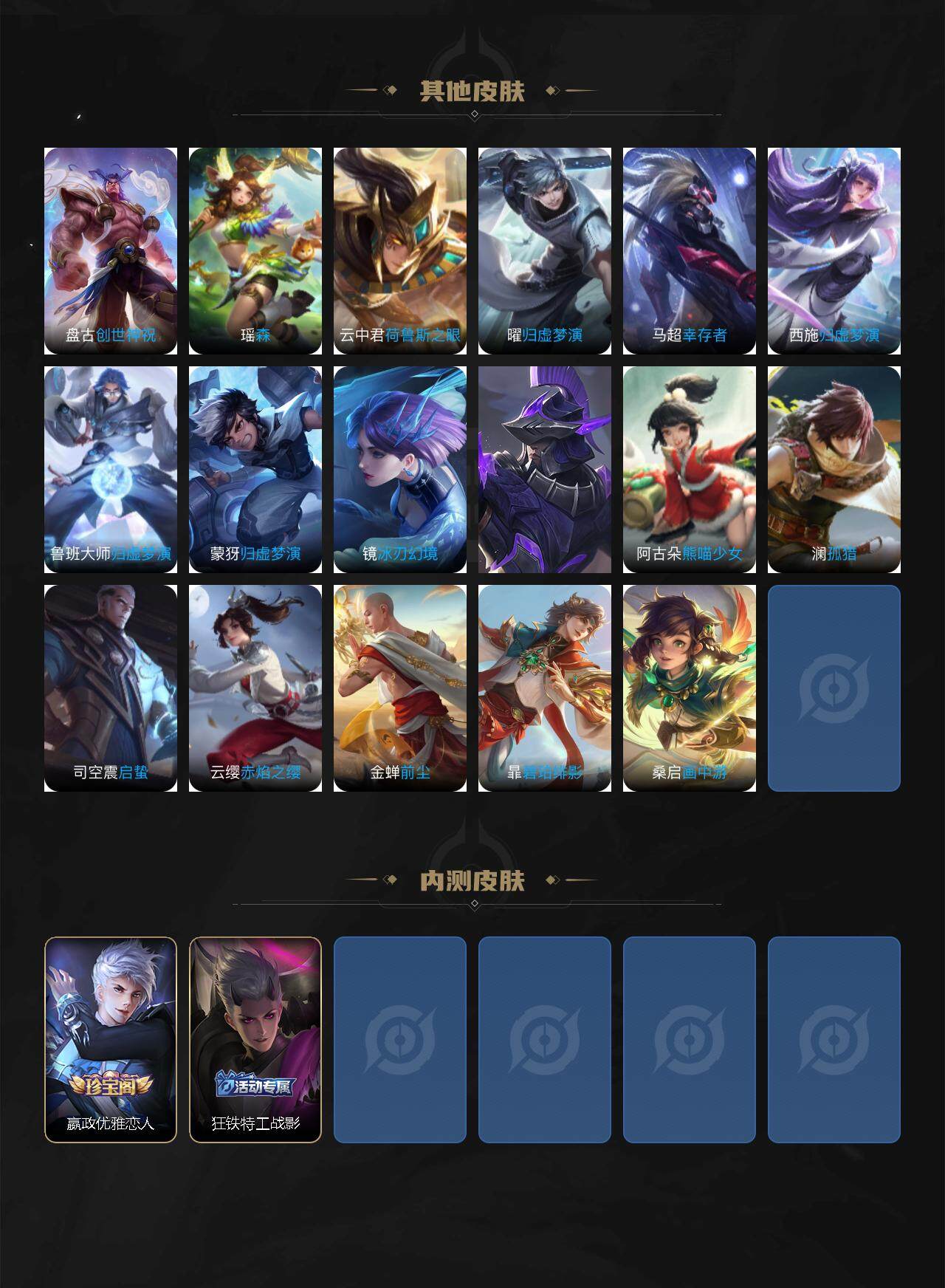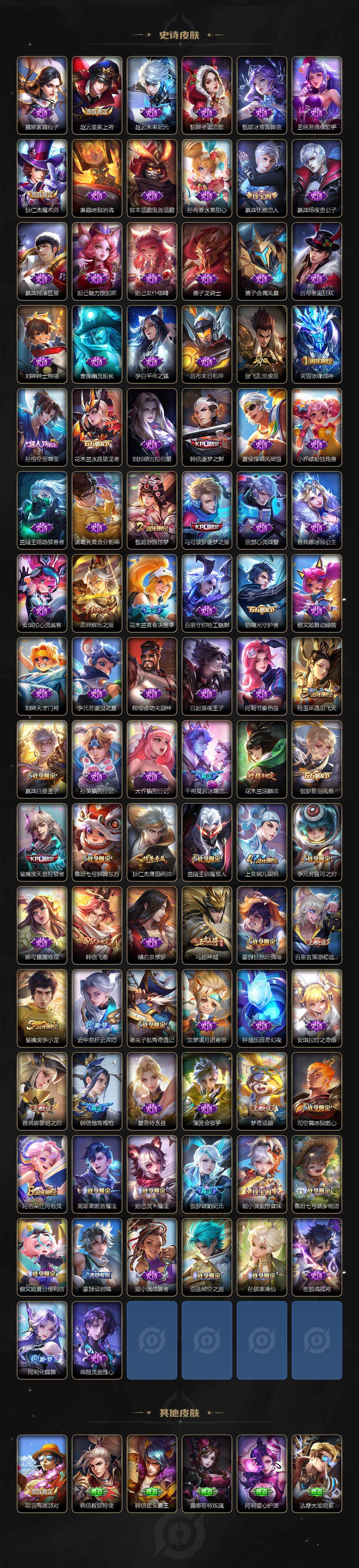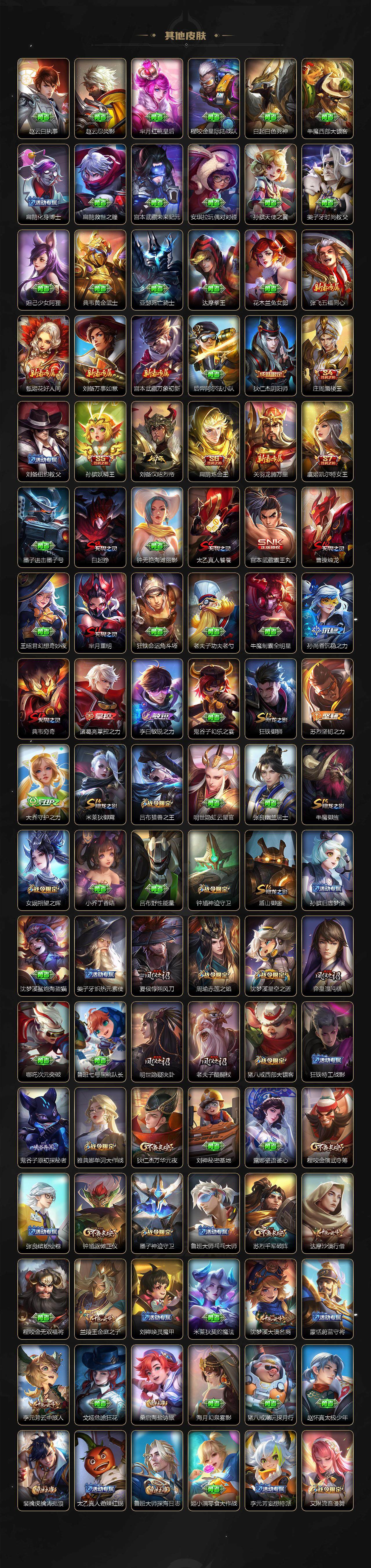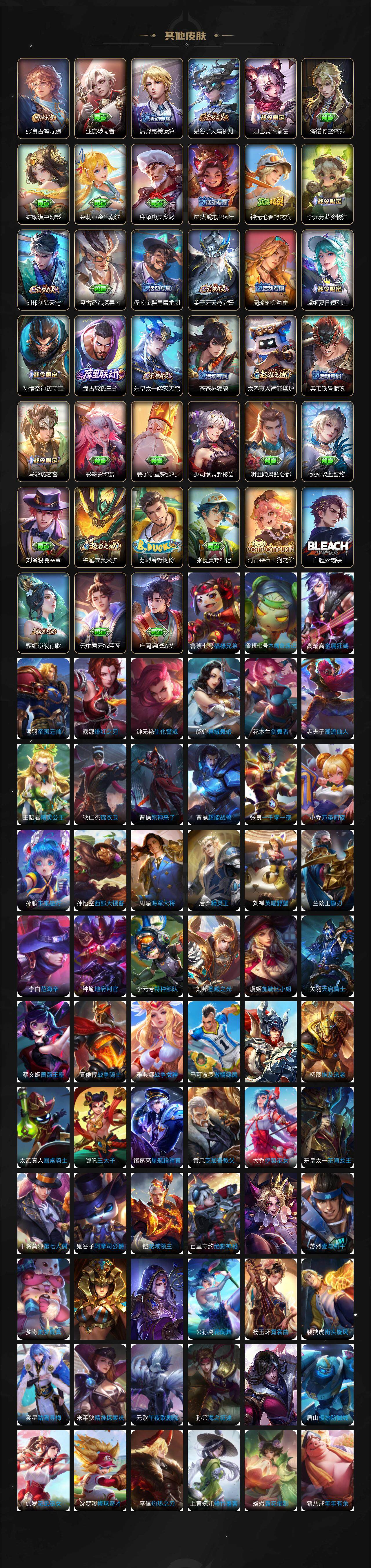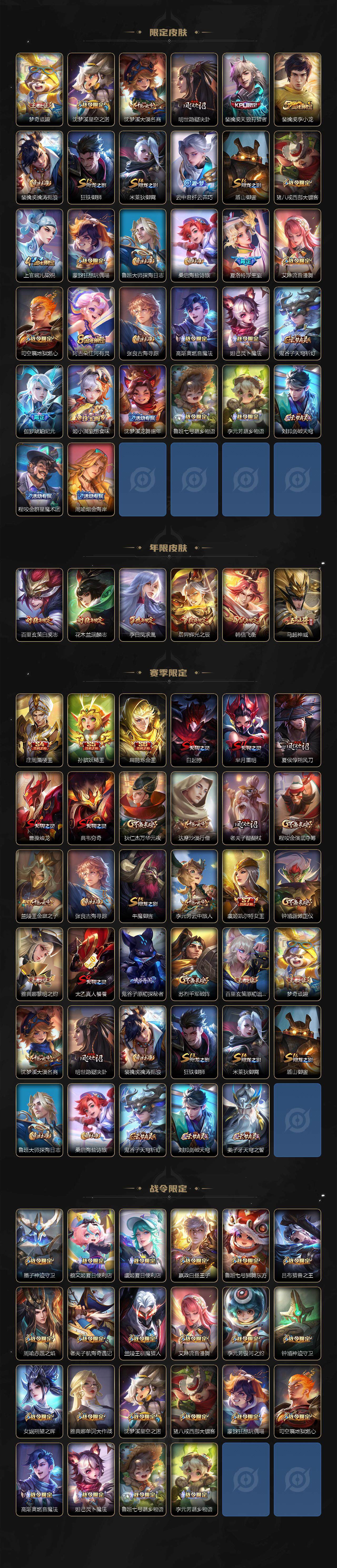 【限定皮肤】:白起狰,公孙离离恨烟,蒙犽顽岩魄,蔡文姬夏日便利店,虞姬夏日便利店,姜子牙天穹之誓,狄仁杰阴阳师,虞姬凯尔特女王,赵云皇家上将,墨子神迹守卫,嬴政优雅恋人,嬴政白昼王子,鲁班七号狮舞东方,庄周蜃楼王,孙膑妖精王,扁鹊炼金王,芈月重明,吕布猎兽之王,周瑜赤莲之焰,夏侯惇朔风刀,甄姬游园惊梦,曹操烛龙,典韦穷奇,马可波罗逐梦之星,马可波罗妄想实况,狄仁杰魔术师,狄仁杰万华元夜,达摩沙漠行僧,项羽海滩派对,老夫子醍醐杖,老夫子航海奇遇记,关羽冰锋战神,程咬金演武夺筹,韩信逐梦之影,韩信飞衡,韩信傲雪梅枪,兰陵王驯魔猎人,兰陵王金庭之子,花木兰青春决赛季,花木兰瑞麟志,孙悟空至尊宝,牛魔御旌,后羿辉光之辰,李元芳银河之约,李元芳云中旅人,虞姬启明星使,钟馗神迹守卫,钟馗驱傩正仪,杨玉环遇见飞天,女娲朔望之晖,干将莫邪冰霜恋舞曲,雅典娜单词大作战,雅典娜黎明之约,太乙真人饕餮,鬼谷子原初探秘者,诸葛亮武陵仙君,苏烈千军破阵,百里玄策白虎志,百里玄策原初追逐者,弈星混沌棋,梦奇顽趣,沈梦溪星空之诺,沈梦溪大漠名商,明世隐疑决卦,裴擒虎天狼狩猎者,裴擒虎李小龙,裴擒虎擒涛扼浪,狂铁御狮,米莱狄御霄,云中君纤云弄巧,盾山御銮,猪八戒西部大镖客,上官婉儿梁祝,蒙犽狂想玩偶喵,鲁班大师探海日志,桑启海盐诗旅,夏洛特浮生妄,艾琳流音漫舞,司空震地狱燃心,阿古朵江河有灵,张良古海寻踪,高渐离燃音魔法,妲己灵卜魔法,鬼谷子天穹祈灯,伽罗琥珀纪元,姬小满妄想食味,沈梦溪龙舞盛年,鲁班七号蔬乡物语,李元芳蔬乡物语,刘邦剑破天穹,程咬金群星