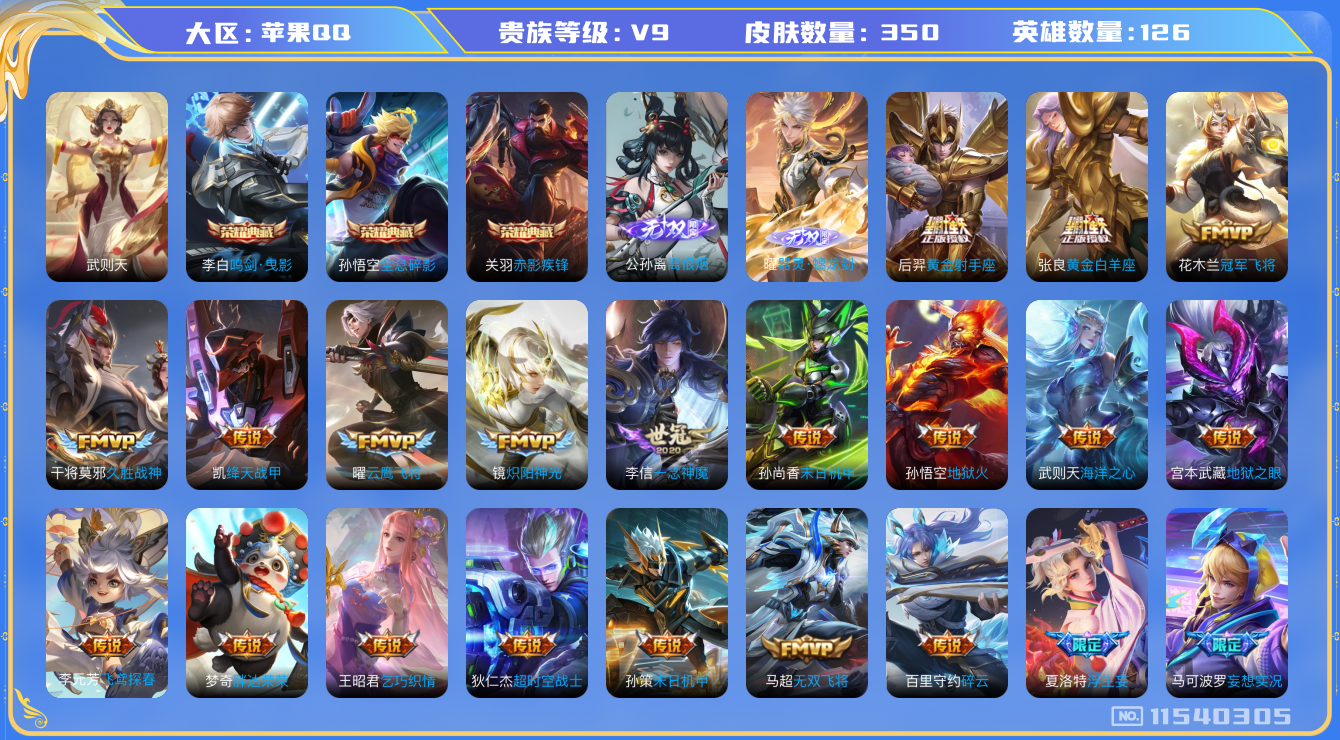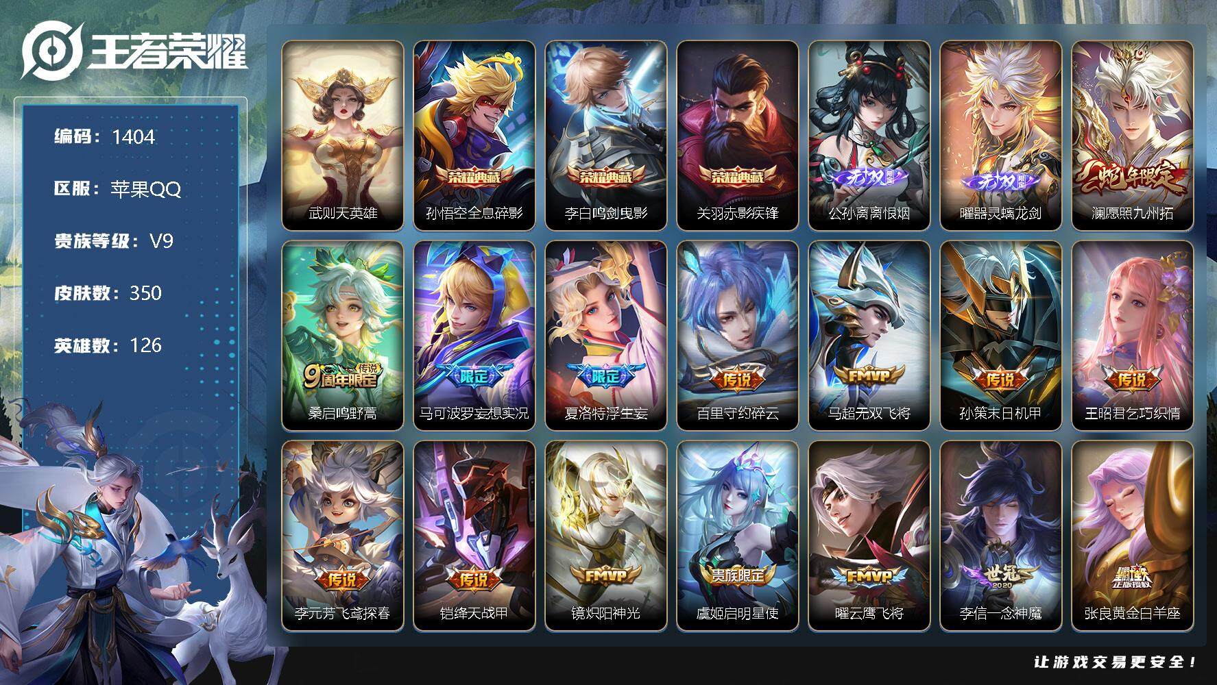 [11540305]【商品标题】:苹果Q-V8-最强王者段位-126英雄-350皮肤-3典藏-0珍品无双-2无双-0珍品传说-27传说-91史诗