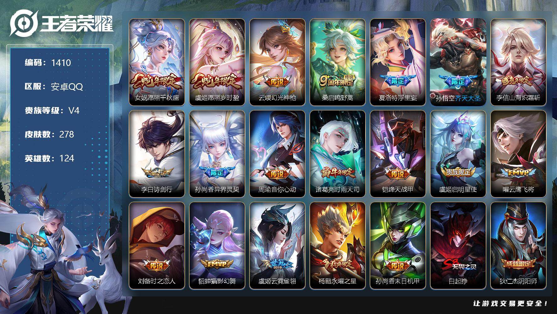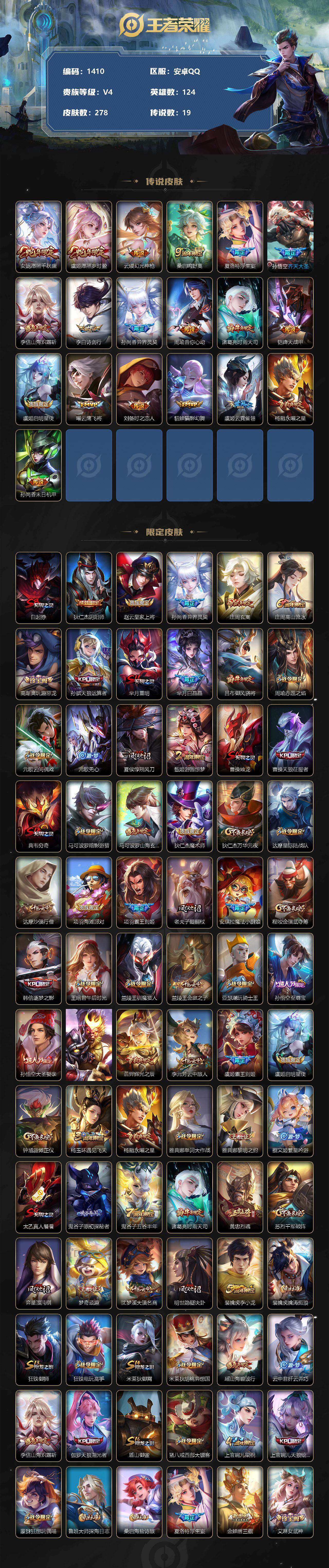 [11541618]【商品标题】:安卓Q-V4-永恒钻石IV段位-124英雄-278皮肤-0典藏-0珍品无双-0无双-0珍品传说-19传说-83史诗
