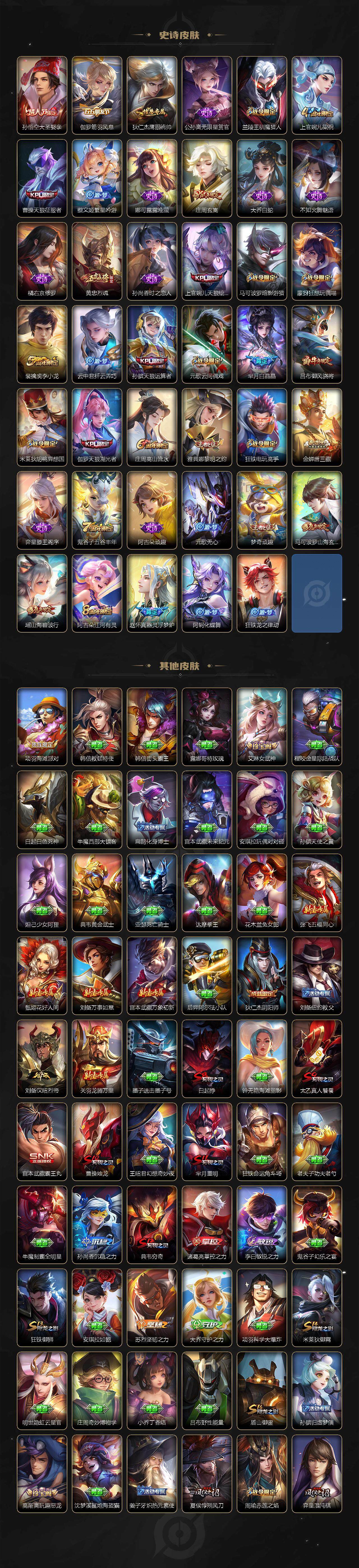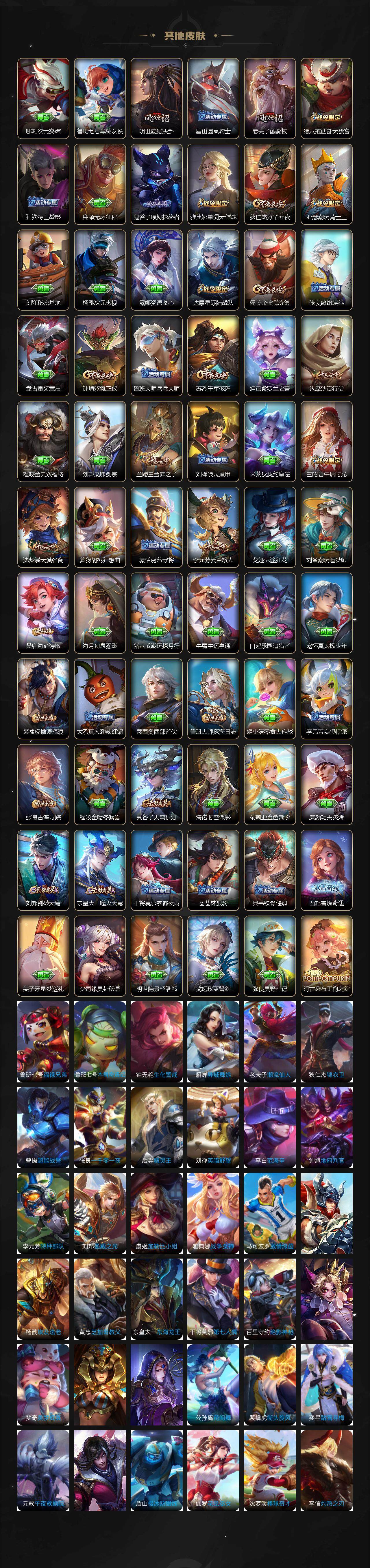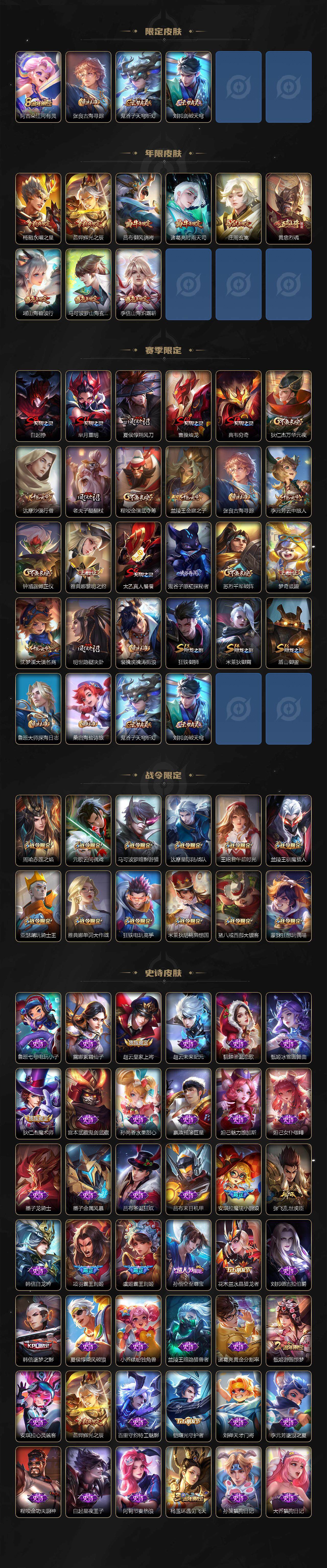 【限定皮肤】:白起狰,狄仁杰阴阳师,赵云皇家上将,孙尚香异界灵契,庄周玄嵩,庄周高山流水,高渐离玩趣恶龙,孙膑天狼运算者,芈月重明,芈月白晶晶,吕布御风骁将,周瑜赤莲之焰,元歌云间偶戏,元歌无心,夏侯惇朔风刀,甄姬游园惊梦,曹操烛龙,曹操天狼征服者,典韦穷奇,马可波罗暗影游猎,马可波罗山海玄木吟,狄仁杰魔术师,狄仁杰万华元夜,达摩星际陆战队,达摩沙漠行僧,项羽海滩派对,项羽霸王别姬,老夫子醍醐杖,安琪拉魔法小厨娘,程咬金演武夺筹,韩信逐梦之影,王昭君午后时光,兰陵王驯魔猎人,兰陵王金庭之子,亚瑟潮玩骑士王,孙悟空至尊宝,孙悟空大圣娶亲,孙悟空齐天大圣,后羿辉光之辰,李元芳云中旅人,虞姬霸王别姬,虞姬启明星使,钟馗驱傩正仪,杨玉环遇见飞天,杨戬永曜之星,雅典娜单词大作战,雅典娜黎明之约,蔡文姬繁星吟游,太乙真人饕餮,鬼谷子原初探秘者,鬼谷子五谷丰年,诸葛亮时雨天司,黄忠烈魂,苏烈千军破阵,弈星混沌棋,梦奇顽趣,沈梦溪大漠名商,明世隐疑决卦,裴擒虎李小龙,裴擒虎擒涛扼浪,狂铁御狮,狂铁电玩高手,米莱狄御霄,米莱狄胡桃异想国,瑶山海碧波行,云中君纤云弄巧,李信山海炽霜斩,伽罗天狼溯光者,盾山御銮,猪八戒西部大镖客,上官婉儿梁祝,上官婉儿天狼绘梦者,蒙犽狂想玩偶喵,鲁班大师探海日志,桑启海盐诗旅,夏洛特浮生妄,金蝉唐三藏,艾琳女武神,阿古朵江河有灵,张良古海寻踪,鬼谷子天穹祈灯,刘邦剑破天穹