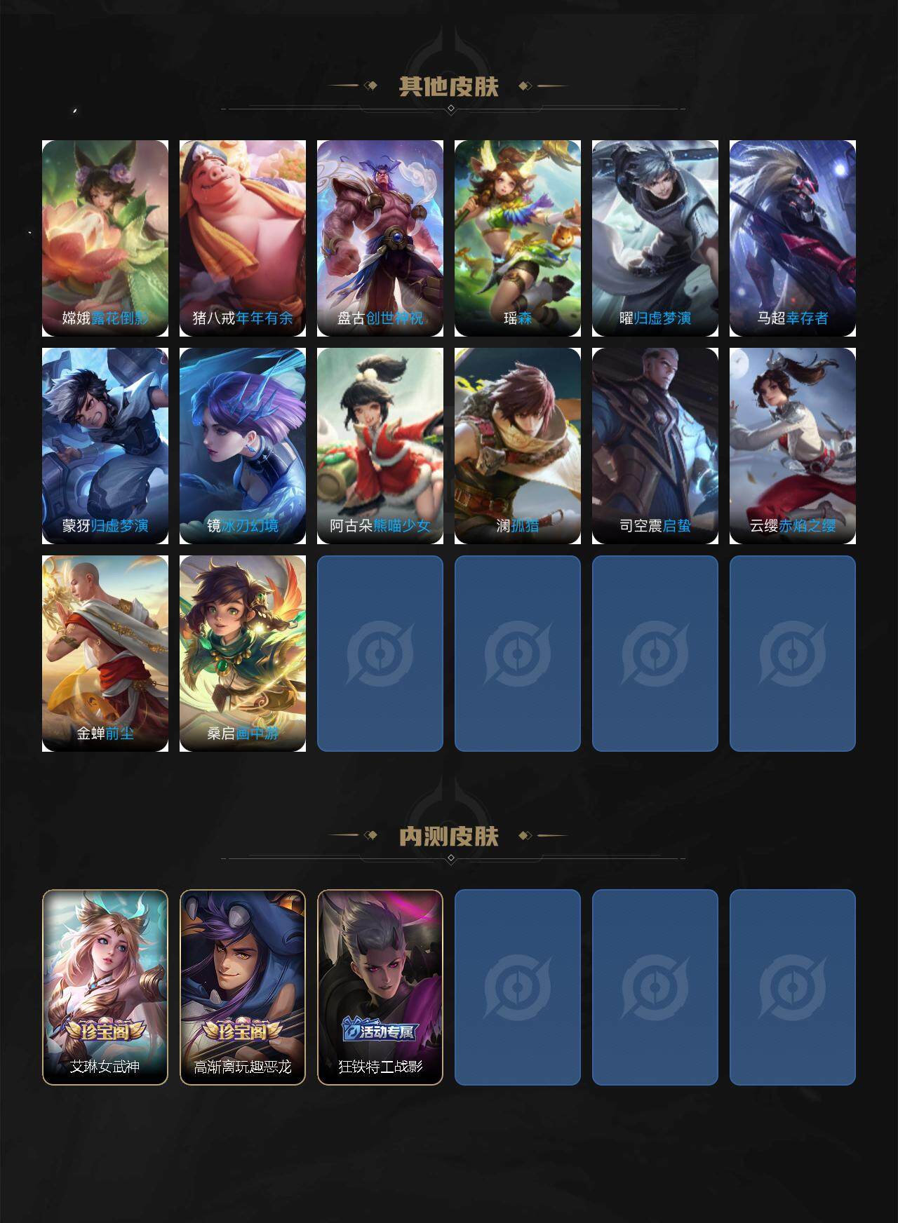 裴擒虎李小龙,上官婉儿梁祝,吕布御风骁将,诸葛亮时雨天司,黄忠烈魂,后羿辉光之辰,庄周玄嵩,曹操天狼征服者,孙膑天狼运算者,上官婉儿天狼绘梦者,伽罗天狼溯光者,韩信逐梦之影,项羽霸王别姬,虞姬霸王别姬,孙悟空大圣娶亲,孙悟空至尊宝,芈月白晶晶,安琪拉魔法小厨娘,孙尚香异界灵契,金蝉唐三藏,李白诗剑行,马可波罗山海·玄木吟,瑶山海·碧波行,桑启鸣野蒿,虞姬愿照·岁时盈,女娲愿照·千秋盛