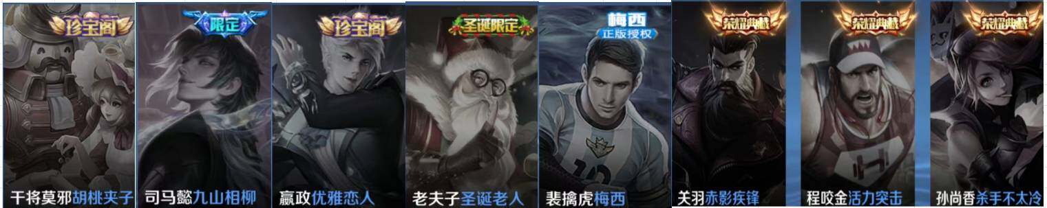 关羽冰锋战神,裴擒虎李小龙,上官婉儿梁祝,牛魔奔雷神使,貂蝉逐梦之音,公孙离祈雪灵祝,吕布御风骁将,诸葛亮时雨天司,赵云龙胆,关羽武圣,黄忠烈魂,张飞虎魄,马超神威,后羿辉光之辰,庄周玄嵩,典韦岱宗,甄姬幽恒,韩信飞衡,伽罗太华,曹操天狼征服者,裴擒虎天狼狩猎者,孙膑天狼运算者,上官婉儿天狼绘梦者,伽罗天狼溯光者,哪吒逐梦之翼,马可波罗逐梦之星,韩信逐梦之影,东皇太一逐梦之光,铠青龙志,百里玄策白虎志,花木兰瑞麟志,苏烈玄武志,百里守约朱雀志,王昭君凤凰于飞,项羽霸王别姬,虞姬霸王别姬,小乔纯白花嫁,周瑜真爱至上,孙悟空大圣娶亲,露娜一生所爱,花木兰默契交锋,兰陵王默契交锋,后羿如梦令,嫦娥如梦令,孙悟空至尊宝,雅典娜神奇女侠,妲己热情桑巴,干将莫邪冰霜恋舞曲,花木兰青春决赛季,蔡文姬奇迹圣诞,妲己时之彼端,公孙离蜜橘之夏,芈月白晶晶,安琪拉魔法小厨娘,赵云引擎之心,孙悟空美猴王,庄周云端筑梦师,鲁班七号乒乒小将,大乔白鹤梁神女,猪八戒猪悟能,廉颇寅虎·御盾,孙尚香异界灵契,孙悟空孙行者,甄姬女儿国国王,镜匿光追影者,韩信傲雪梅枪,鲁班七号寅虎·瑞焰,孙膑寅虎·展翼,杨玉环寅虎·心曲,裴擒虎寅虎·赤拳,云中君时之祈愿,瑶时之祈愿,女娲补天,赵云百木心枪,公孙离玉兔公主,露娜启示之音,夏侯惇匿光决锋者,后羿无尽星芒,马可波罗深海之息,金蝉唐三藏,娜可露露前尘镜,橘右京枫霜尽,鲁班大师匿光启智者,妲己时之奇旅,王昭君星穹之声,不知火舞绯月行,上官婉儿神器·万象笔,盾山梦圆繁星,墨子降魔,李白诗剑行,马可波罗山海·玄木吟,盘古冰霜神祇,瑶山海·碧波行,兰陵王影龙天霄,西施至美·乘鲤谣,甄姬至美·化雀舞,夏侯惇霜北刀,桑启鸣野蒿,艾琳陌上桑,王昭君映山客,澜愿照·九州拓,蔡文姬愿照·福禄聚,虞姬愿照·岁时盈,司空震愿照·山河定,妲己愿照·众生和,女娲愿照·千秋盛