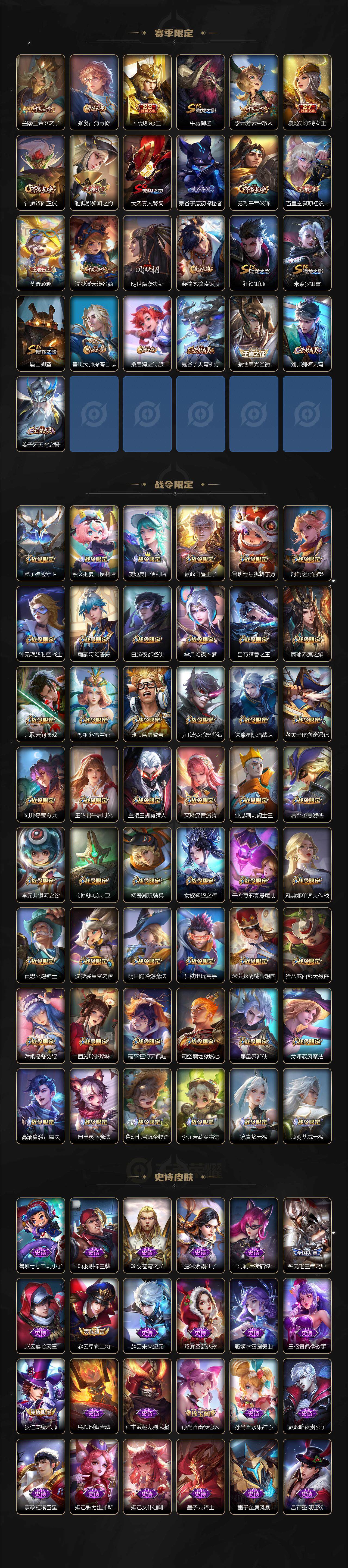 亚瑟狮心王,庄周蜃楼王,孙膑妖精王,扁鹊炼金王,虞姬凯尔特女王,白起狰,太乙真人饕餮,曹操烛龙,芈月重明,典韦穷奇,狂铁御狮,米莱狄御霄,牛魔御旌,盾山御銮,夏侯惇朔风刀,明世隐疑决卦,老夫子醍醐杖,鬼谷子原初探秘者,狄仁杰万华元夜,程咬金演武夺筹,钟馗驱傩正仪,苏烈千军破阵,吕布猎兽之王,嬴政白昼王子,女娲朔望之晖,典韦蓝屏警告,钟馗神迹守卫,鲁班七号狮舞东方,沈梦溪星空之诺,李元芳银河之约,刘邦夺宝奇兵,马可波罗暗影游猎,蒙犽狂想玩偶喵,元歌云间偶戏,弈星混沌棋,达摩沙漠行僧,兰陵王金庭之子,沈梦溪大漠名商,李元芳云中旅人,桑启海盐诗旅,裴擒虎擒涛扼浪,鲁班大师探海日志,张良古海寻踪,项羽苍威无极,镜青焰无极