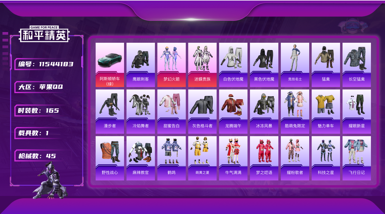 [11544183]2粉装 1载具 4印记 可二次 可修改实名 优质装备:阿斯顿·马丁DBS(绿),梦幻火箭(新101)(新火箭少女101粉色套装),迷蝶贵族 热门装扮:鹰眼刺客 紫色装扮:田园牧歌,轻风白浪,和煦暖阳,SS22特训,SS23特训,幻彩翩翩,妙红点点,SS21特训,冷焰舞者,科技之星,SS14特训,SS19特训,吉莉礼服,酷萌兔限定,野性战心,长空猛禽,耀眼新星,飞行日记,龙腾端午,魅力单车,鹤鸣,麻辣教官,黑色伏地魔,柠萌假日,白色伏地魔,甜蜜告白,福星高照,王牌教练,灰色格斗者,牛气满满,猛禽,SS28特训,竞技名士,SS24特训(SS24特训套装),SS25特训,梦之呓语,耀粉歌者,青玉碎影,绯格组合,萌黄之夏,漫步者,冰冻风暴,光之冒险 优质战备:梦幻火箭降落伞,梦幻火箭飞行器,荧光虫舞降落伞,香水柠檬降落伞