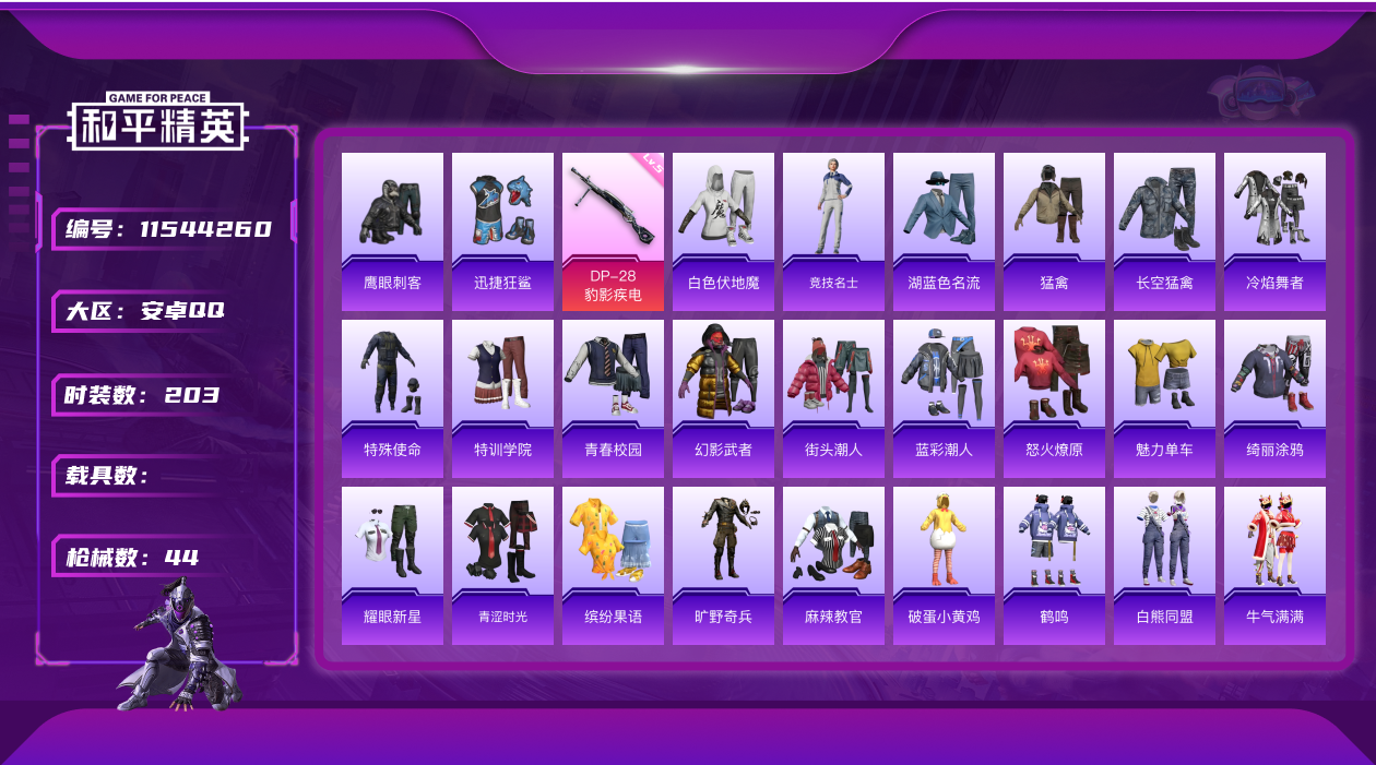 [11544260]1特效枪 1印记 可二次 可修改实名 热门装扮:迅捷狂鲨,鹰眼刺客 稀有枪皮:DP-28-豹影疾电 五级特效枪:五级DP-28-豹影疾电 紫色装扮:SS22特训,SS21特训,冷焰舞者,SS30特训套装,SS33特训套装,青涩时光,顶瓜瓜,SS20特训,SS16特训,SS13特训,SS17特训,长空猛禽,青春校园,缤纷果语,耀眼新星,蓝彩潮人,虎虎生威吉莉,街头潮人,飞行日记,魅力单车,鹤鸣,麻辣教官,龙的传人,幻影武者,怒火燎原,湖蓝色名流,绮丽涂鸦,白熊同盟,白色伏地魔,破蛋小黄鸡,福星高照,牛气冲天,牛气满满,猛禽,特殊使命,特训学院,SS29特训,星途旅人,SS28特训,玉兔迎春,竞技名士,SS26特训,耀粉歌者,绯格组合,旷野奇兵