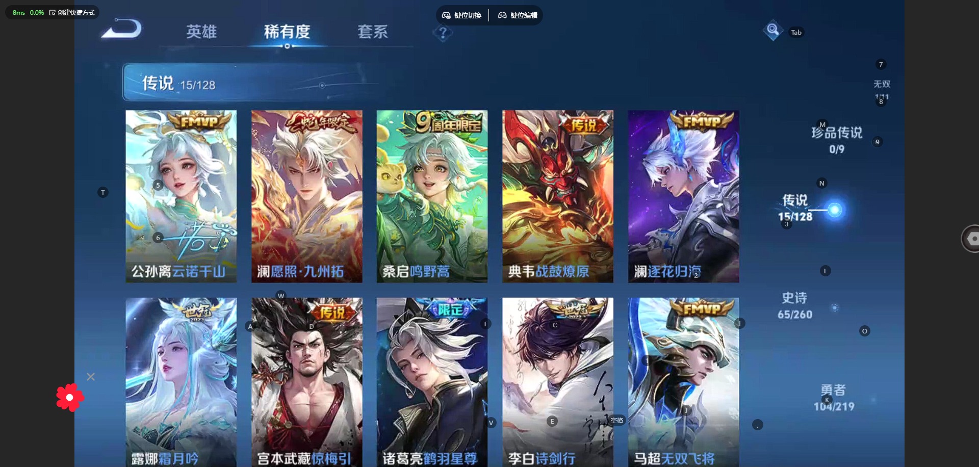 - [11884199]V8 1典藏 27传说 125英雄 262皮肤 可修改实名 优质装备:弑枪猎影(韩信典藏),黄金射手座,云鹰飞将(小将军),久胜战神,炽阳神光,仲夏夜之梦(大飞蛾),地狱之眼,无双飞将,山海·炽霜斩(李信年限),山海·琳琅生(小乔年限),山海·苍雷引(电光曜子),记忆之芯(机甲兔),霜月吟,琥珀纪元马超 传说皮:典韦战鼓燎原,祥瑞亨通,幻光神枪 珍宝阁皮:优雅恋人,女武神 限定皮:愿照·九州拓(澜年限),愿照·岁时盈(虞姬年限),愿照·山河定(司空震年限),逐霄战戟,时雨天司(水龙头),山海·碧波行(瑶年限),无限倾心-项羽,高山流水,无限倾心-虞姬,齐天大圣,怒海麟威,五谷丰年,冰锋战神,龙胆,虎魄,李小龙,默契交锋-兰陵王,默契交锋-花木兰,寅虎·赤拳(老虎年限),时之祈愿-云中君,神器·万象笔,山海·玄木吟(马可年限) 史诗皮:器灵·浮梦炉,化蝶舞,星界战将,龙之律动,雪豹·霜爪,茶境仙,东方月初,芈月浮光幕影,琥珀纪元伽罗,蔬乡物语(鲁班七号),紫霞仙子,白龙吟,黄金分割率,特工魅影,千年之狐,永昼,江河有灵,魅语,百解令(蒙犽),高渐离燃音魔法,蒙恬荣光圣徽,无限星赏官,匿光破解者,偶像歌手,晚萤,电玩·爆裂旋风,暗夜猫娘,猫狗日记-大乔,时之恋人-孙尚香,乱世虎臣,节奏热浪,修罗,女仆咖啡,摇滚巨星,水果甜心,星夜王子,暗隐猎兽者,幽灵船长,鬼剑武藏,暗渊魔法,心灵战警,乐园奇幻夜,地狱岩魂,纤云弄巧,繁星吟游(呼啦呼啦),拒霜思,缤纷独角兽,乘风破浪,逐浪之夏,龙鼓争鸣,水晶猎龙者,曙光守护者,热力回旋,金属风暴,圣诞恋歌,鹰眼统帅,魅力维加斯,黎明之约,赏金猎手,天秀·音浪,滕王阁序,无心,玫瑰异探