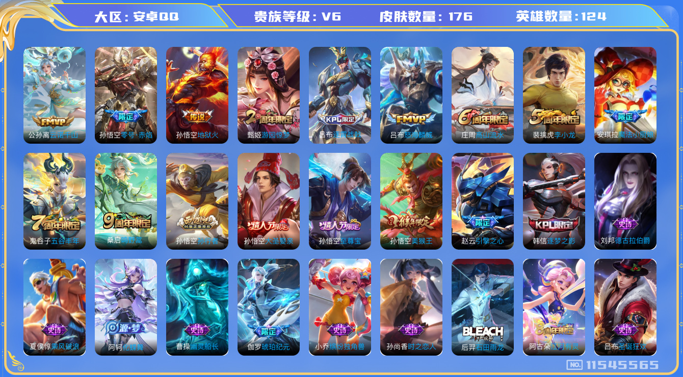 [11545565]V6 5传说 124英雄 176皮肤 可修改实名 优质装备:地狱火,零号·赤焰,涂山容容 传说皮:云诺千山 珍宝阁皮:优雅恋人,蔷薇恋人 限定皮:逐霄战戟,鸣野蒿,至尊宝,魔法小厨娘,高山流水,怒海麟威,五谷丰年,游园惊梦,李小龙,逐梦之影,孙行者,大圣娶亲,引擎之心,美猴王 史诗皮:苍鳞隐世,化蝶舞,龙之律动,石田雨龙,琥珀纪元伽罗,特工魅影,江河有灵,雪夜绮愿(周瑜),百解令(蒙犽),冰冠公主,时之恋人-孙尚香,天才门将,功夫厨神,德古拉伯爵,幽灵船长,鬼剑武藏,纤云弄巧,拒霜思,缤纷独角兽,乘风破浪,圣诞狂欢,圣诞恋歌,鹰眼统帅,魅力维加斯,无心