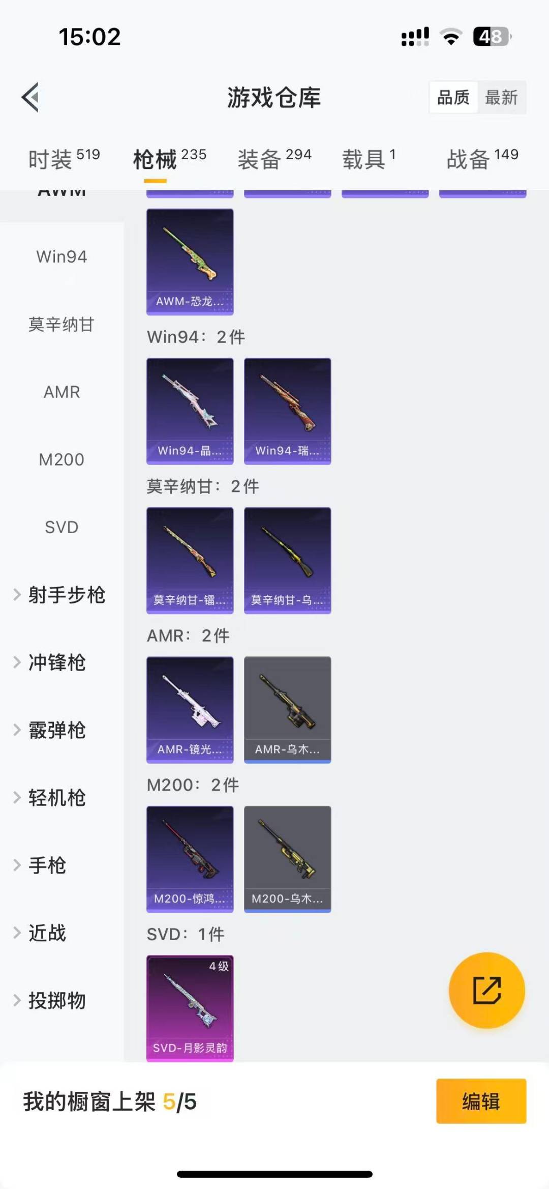 M416-梨园星光,GROZA-林间仙鹿,M762-奇异狩猎者,M762-瑞龙福将,M762-风花雪月,S686-奇异狩猎者,M249-金丰海韵