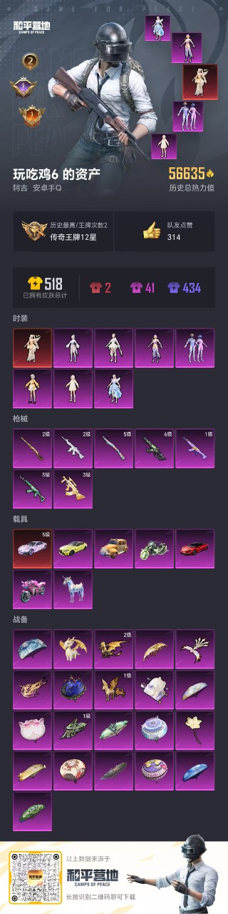 [11546442]1红装 7粉装 7特效枪 7载具 2印记 可二次 可修改实名 优质装备:精灵之光-露米娜,一级精灵之光-露米娜(1级露米娜),仰望U9(赤霞丹朱),星梦玉骢,幽焰风驰摩托车,宝马M4(圣保罗黄),僚机-圣域龙宝,梦幻火箭(新101)(新火箭少女101粉色套装),AKM魔法神域,M762-青锋波束,GROZA-精灵之光,AKM-幽焰骑士,千金淑猫,女娲灵识,M416-女娲灵识,Kar98K-圣域龙灵,Kar98K-巳巳如意 时装数:413 枪械数:104 战备数:7 热门装扮:呆萌星弥,白勺歌姬,星梦奇缘,金域紫灵,东方飞龙 载具:萌喵橘座,双人摩托-梦幻火箭 六级特效枪:六级AKM-幽焰骑士 五级特效枪:五级M762-青锋波束,五级Kar98K-巳巳如意 三级特效枪:三级GROZA-精灵之光 二级特效枪:二级M416-女娲灵识,二级Kar98K-圣域龙灵 一级特效枪:一级AKM-魔法神域 紫色装扮:小熊娃娃,雏菊兔兔,萝兰蝴蝶,SS29特训,多纳泰罗,拉斐尔,鹿角斗士,狂花道·娜可露露,先驱飞行员,星途旅人,粉雾星云,极地流光,鱼渊荷华,燕燕于飞,巳巳如意,青团波波,糖糖葫芦,棉花软糖,竞技名士,摩登魅猫,街头风暴,银尘,智谋强哥,春日漫步,蓝冰羽,紫幽梦,SS32特训服(SS32特训套装),风舞幻音,旋风灵鼠,恋语绒绒,雪夜云雾 优质战备:星梦奇缘降落伞,拳皇·狂花道降落伞,精灵之光降落伞,曦光华影飞行器,星途旅人降落伞,英伦信使降落伞,时空协奏降落伞,忍者神龟降落伞,千金淑猫降落伞,沙丘之主天马飞行器,幽焰列车飞行器,幽焰骑士降落伞,鬼刀降落伞,万象金身飞行器,凤舞九天飞行器,酣梦熊熊飞行器,月影灵韵降落伞,圣域龙灵降落伞,圣域金龙飞行器,雪月幻音降落伞,梦幻火箭降落伞 二级优质战备:二级圣域金龙飞行器