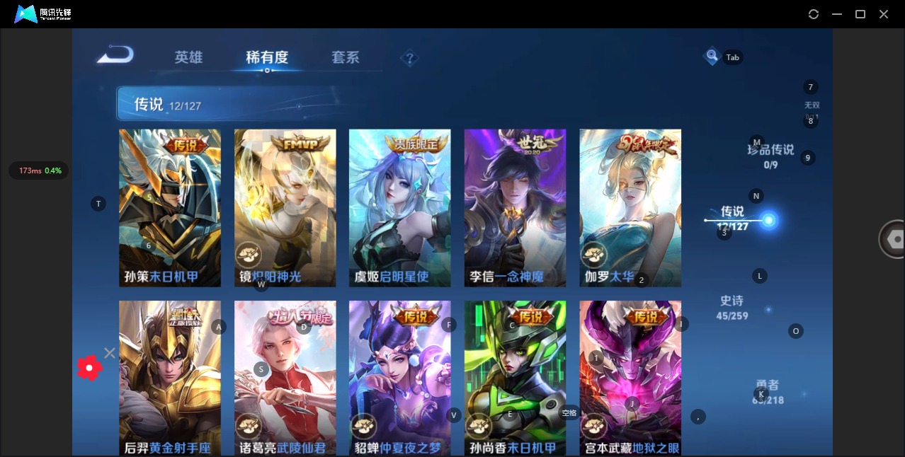 - [11604470]V8 1珍品传说 16传说 125英雄 261皮肤 典藏英雄武则天 可修改实名 优质装备:怪盗基德,一念神魔,末日机甲-孙尚香(绿蚂蚱),地狱火,地狱之眼,无双飞将,妄想实况,澜逐花归海 传说皮:祥瑞亨通,幻光神枪 珍宝阁皮:蔷薇恋人 限定皮:愿照·九州拓(澜年限),陌上桑,鸣野蒿,至尊宝,白虎志(电光耗子),白晶晶,时雨天司(水龙头),遇见飞天,齐天大圣,武圣,御风骁将(吕布年限),李小龙,逐梦之影,朱雀志(守约年限),霸王别姬-项羽,猪悟能,大圣娶亲,引擎之心,青春决赛季,美猴王 史诗皮:器灵·浮梦炉,谪仙醉月,石田雨龙,茶境仙,破空之剑,东方月初,百相守梦-百里守约,星界特工,百相守梦-黄忠,紫霞仙子,黄金分割率,特工魅影,千年之狐,百解令(蒙犽),蒙恬荣光圣徽,冰冠公主,偶像歌手,白蛇,电玩·爆裂旋风,龙骑士(小龙虾),末日机甲-吕布,猫狗日记-孙策,乱世虎臣,女仆咖啡,水果甜心,星夜王子,心灵骇客,功夫厨神,德古拉伯爵,暗隐猎兽者,幽灵船长,鬼剑武藏,心灵战警,舞动绿茵,地狱岩魂,纤云弄巧,繁星吟游(呼啦呼啦),拒霜思,逐浪之夏,水晶猎龙者,曙光守护者,箭羽风息,金属风暴,圣诞狂欢,圣诞恋歌,鹰眼统帅,暗夜贵公子,魅力维加斯,黎明之约,赏金猎手,未来纪元-赵云