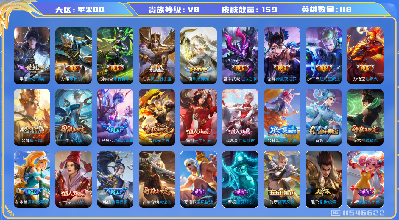 [11546622]V8 12传说 118英雄 159皮肤 可修改实名 优质装备:黄金射手座,炽阳神光,一念神魔,末日机甲-孙尚香(绿蚂蚱),地狱火,仲夏夜之梦(大飞蛾),地狱之眼,超时空战士-狄仁杰,末日机甲-孙策 限定皮:太华(伽罗年限),武陵仙君(小桃花),傲雪梅枪,瑞麟志(木兰年限),梁祝,朱雀志(守约年限),辉光之辰,一生所爱,大圣娶亲,青春决赛季,冰霜恋舞曲,蜜橘之夏,唐三藏 史诗皮:电玩小子(小书包),白龙吟,黄金分割率,特工魅影,千年之狐,永昼,偶像歌手,龙骑士(小龙虾),魅语,晚萤,末日机甲-吕布,乱世虎臣,修罗,水果甜心,暗隐猎兽者,幽灵船长,暗渊魔法,繁星吟游(呼啦呼啦),缤纷独角兽,乘风破浪,逐浪之夏,水晶猎龙者,箭羽风息,原初追逐者,鹰眼统帅,魅力维加斯,赏金猎手,未来纪元-赵云