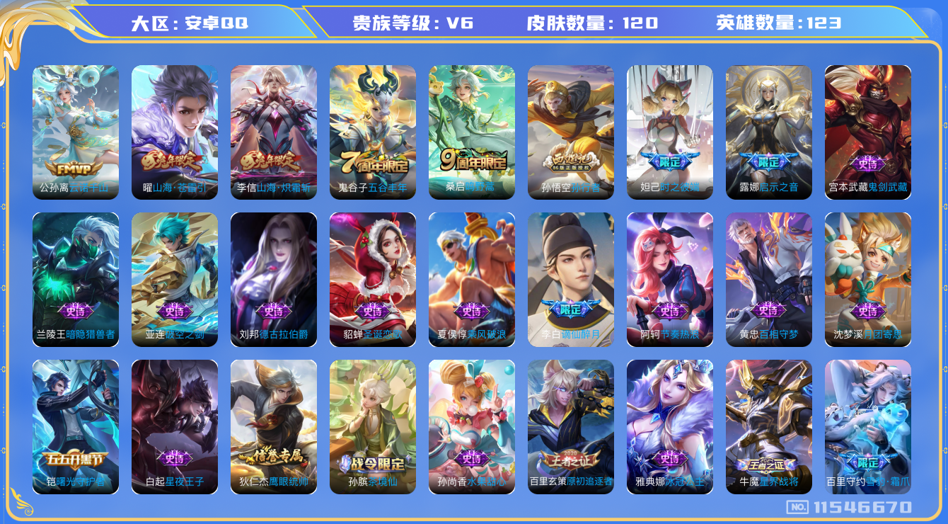 [11546670]V6 5传说 123英雄 120皮肤 可修改实名 优质装备:山海·炽霜斩(李信年限),山海·苍雷引(电光曜子) 传说皮:云诺千山 珍宝阁皮:女武神 限定皮:鸣野蒿,时之彼端,五谷丰年,孙行者,启示之音 史诗皮:鸭鸭历险记-刘禅,星界战将,龙之律动,雪豹·霜爪,茶境仙,破空之剑,谪仙醉月,百相守梦-黄忠,紫霞仙子,特工魅影,冰冠公主,末日机甲-吕布,节奏热浪,修罗,水果甜心,星夜王子,德古拉伯爵,暗隐猎兽者,鬼剑武藏,乘风破浪,逐浪之夏,月团寄思,曙光守护者,原初追逐者,圣诞狂欢,圣诞恋歌,鹰眼统帅,无心