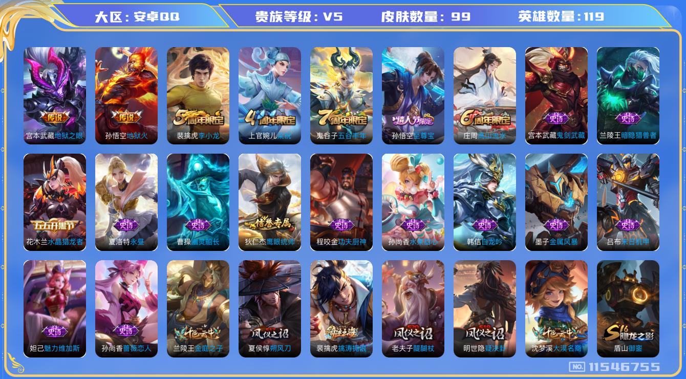 - [12360798]王者荣耀-安卓QQ 贵族5 传说皮肤1 史诗皮肤27 皮肤数量120 紫星币3000多 皮肤价值:66124 英雄116 绝世王者 总场次6252 【内测皮肤】1 姬小满_妄想食味【传说皮肤】1 镜_炽阳神光 【史诗皮肤】27 公孙离_涂山容容 牛魔_星界战将 百里守约_百相守梦 镜_青焰无极 赵云_皇家上将 韩信_飞衡 后羿_如梦令 孙悟空_大圣娶亲 伽罗_箭羽风息 花木兰_水晶猎龙者 鬼谷子_五谷丰年 上官婉儿_梁祝 鲁班七号_狮舞东方 大乔_猫狗日记 阿轲_节奏热浪 夏侯惇_乘风破浪 李白_千年之狐 曹操_幽灵船长 宫本武藏_鬼剑武藏 刘禅_绅士熊喵 墨子_金属风暴 孙尚香_水果甜心 赵云_未来纪元 云中君_纤云弄巧 梦奇_顽趣 狄仁杰_鹰眼统帅 【其他皮肤】92 哪吒_罗小黑战记 甄姬_逆浪荇歌 戈娅_玫蓝誓约 苍_苍林狼骑 老夫子_百相守梦 东皇太一_噬灭天穹 姜子牙_天穹之誓 周瑜_熔金海岸 项羽_苍威无极 程咬金_群星魔术团 刘邦_剑破天穹 苍_维京掠夺者 铠_龙域领主 项羽_海滩派对 钟馗_神迹守卫 鬼谷子_天穹祈灯 鲁班大师_探海日志 桑启_海盐诗旅 李元芳_云中旅人 钟馗_驱傩正仪 狄仁杰_万华元夜 鬼谷子_原初探秘者 老夫子_醍醐杖 明世隐_疑决卦 弈星_混沌棋 夏侯惇_朔风刀 盾山_御銮 牛魔_御旌 米莱狄_御霄 狂铁_御狮 典韦_穷奇 芈月_重明 曹操_烛龙 哪吒_热血海滩 鲁班大师_乓乓大师 盾山_圆桌骑士 扁鹊_化身博士 关羽_龙腾万里 宫本武藏_万象初新 戈娅_危途狂花 鲁班七号_黑桃队长 明世隐_虹云星官 鬼谷子_幻乐之宴 老夫子_功夫老勺 王昭君_幻想奇妙夜 后羿_阿尔法小队 达摩_拳王 阿轲_爱心护理 安琪拉_玩偶对对碰 扁鹊_救世之瞳 达摩_大发明家 典韦_黄金武士 韩信_街头霸王 韩信_教廷特使 牛魔_西部大镖客 武则天_东方不败 赵云_忍炎影 妲己_少女阿狸 亚瑟_死亡骑士 李白_敏锐之力 宫本武藏_霸王丸 狄仁杰_阴阳师 刘备_汉昭烈帝 司空震_启蛰 澜_孤猎 阿古朵_熊喵少女 镜_冰刃幻境 鲁班大师_归虚梦演 马超_幸存者 云中君_荷鲁斯之眼 猪八戒_年年有余 上官婉儿_修竹墨客 李信_灼热之刃 伽罗_花见巫女 裴擒虎_街头旋风 公孙离_花间舞 明世隐_占星师 百里守约_绝影神枪 黄忠_芝加哥教父 诸葛亮_星航指挥官 哪吒_三太子 马可波罗_激情绿茵 蔡文姬_蔷薇王座 虞姬_加勒比小姐 李元芳_特种部队 李白_范海辛 兰陵王_隐刃 花木兰_剑舞者 鲁班七号_木偶奇遇记 鲁班七号_福禄兄弟 孙悟空_西部大镖客 小乔_万圣前夜
